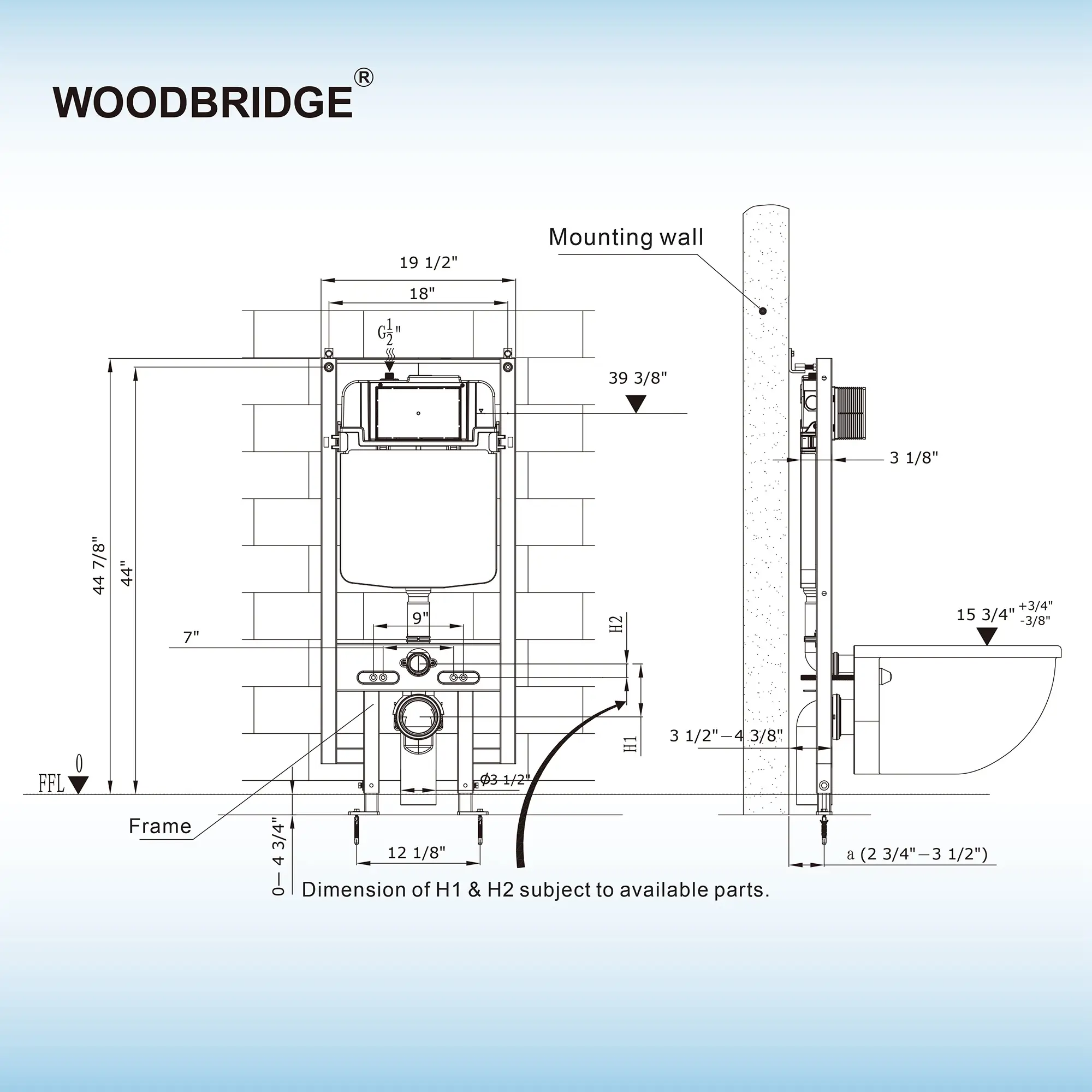 WOODBRIDGE In-Wall 0.8 GPF/1.60 GPF Dual FlusToilet Tank Carrier System for 2 x 4 stud installation, WHTA001