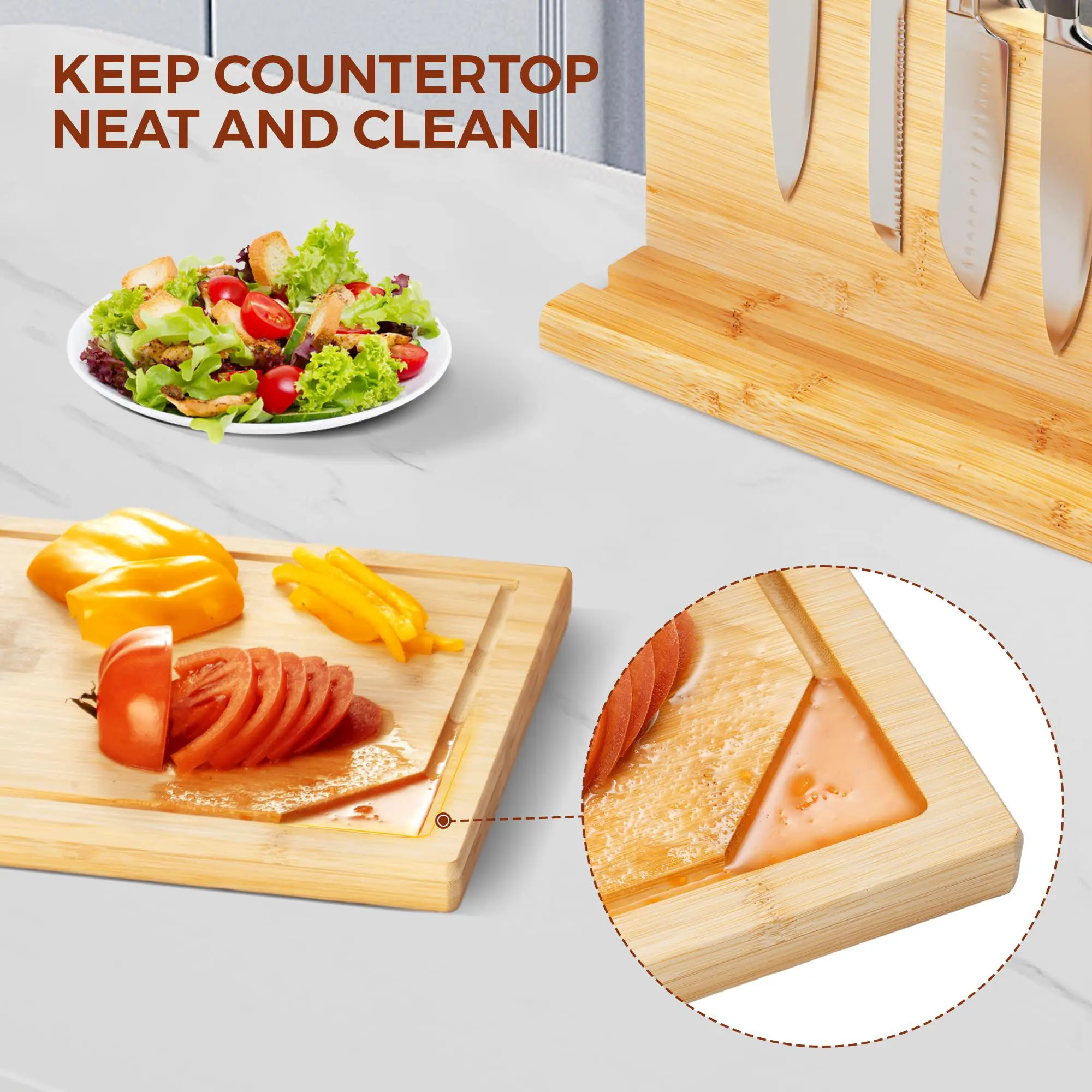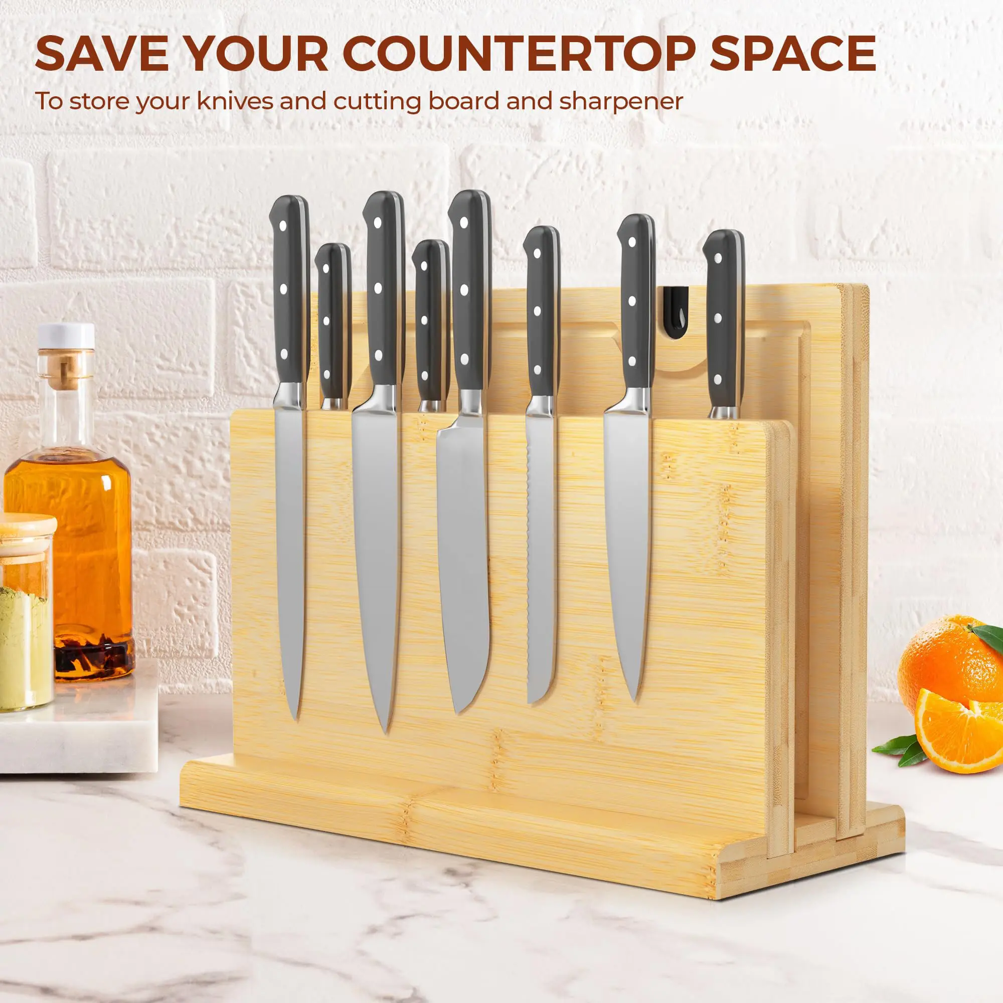 Bamboo Cutting Board for Kitchen with Multiuse Magnetic Knife Holder Combo with Knife Sharpener - Magnetic Knife Block- Cutlery Display Stand and Storage Rack