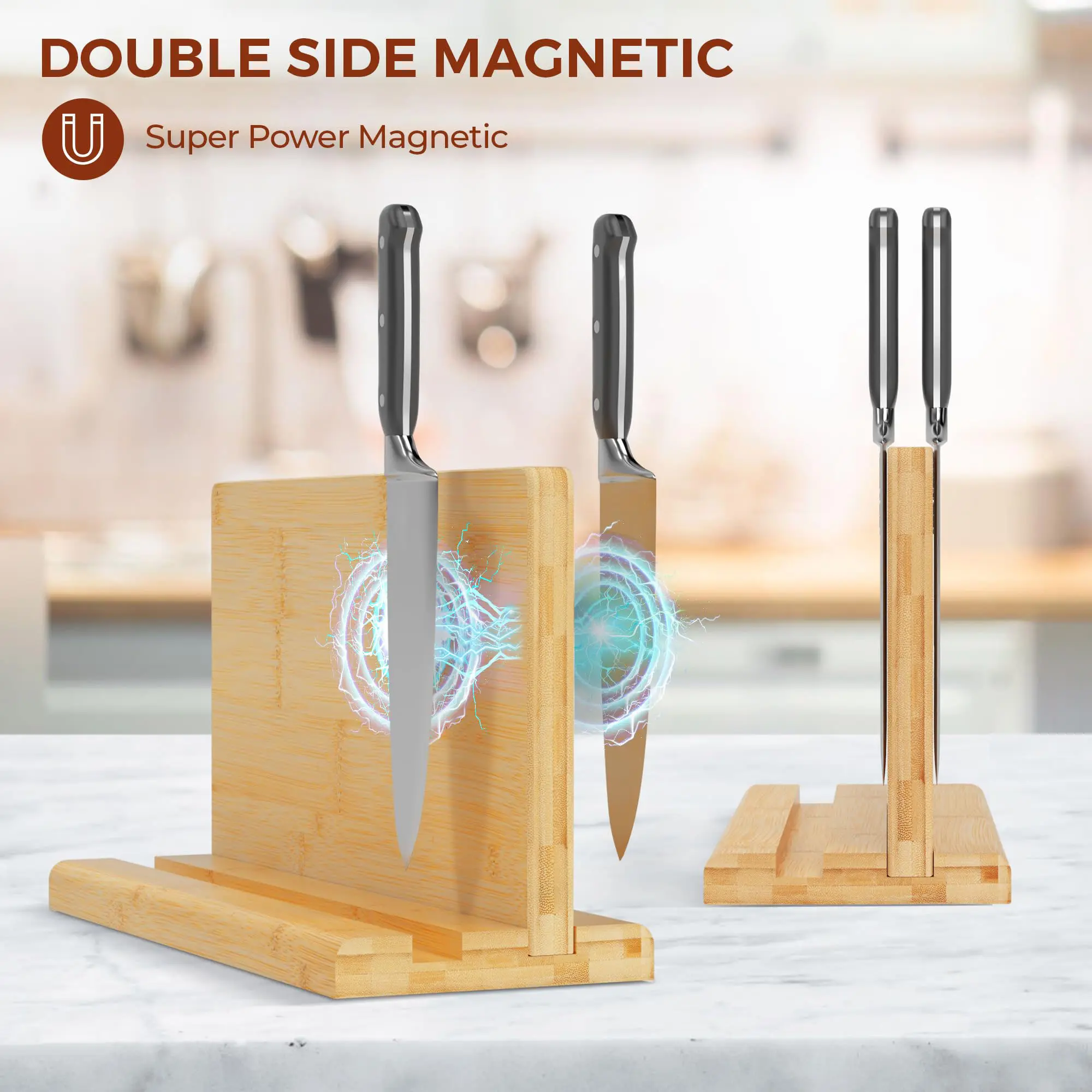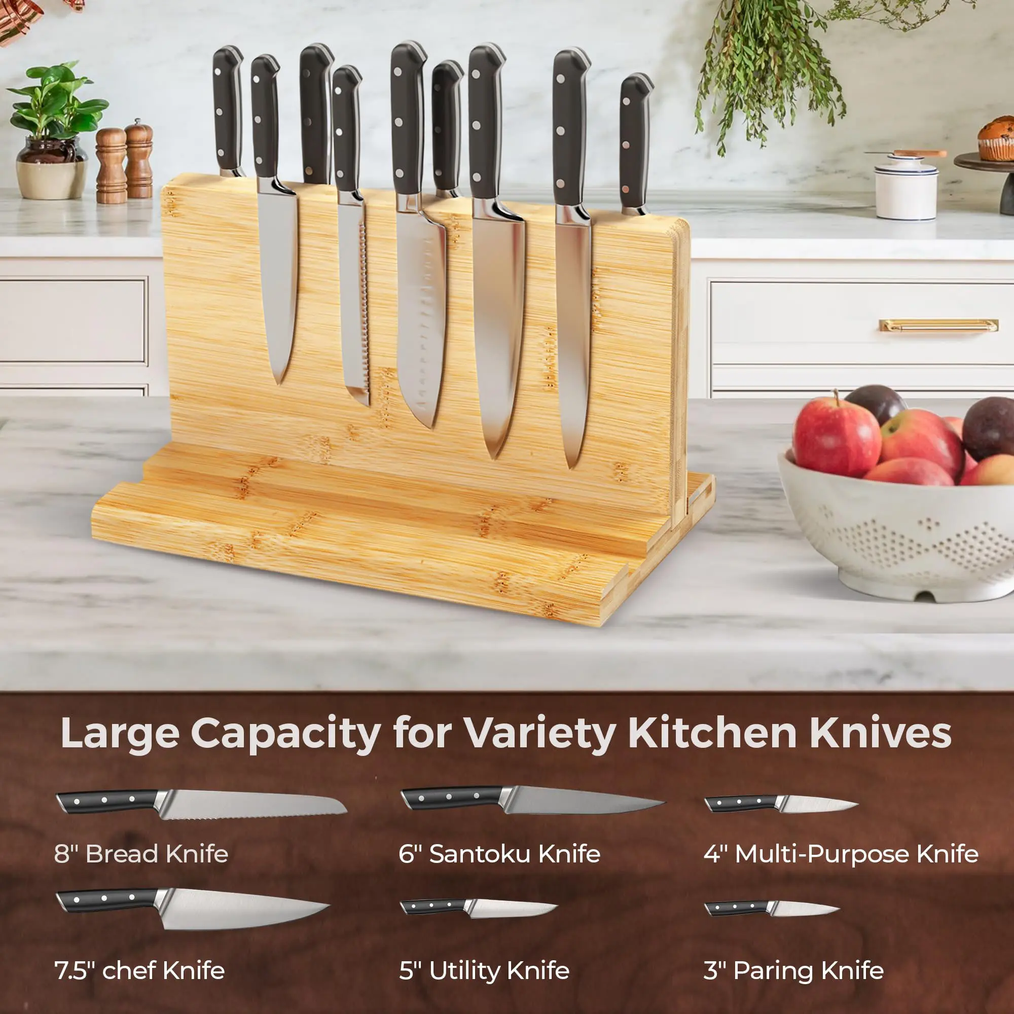 The double-sided magnetic knife block is designed to accommodate a variety of knives, including Japanese knives, chef knives, santoku knives, bread knives and steak knives. The magnetic feature ensures that your blades stay securely in place while you work.