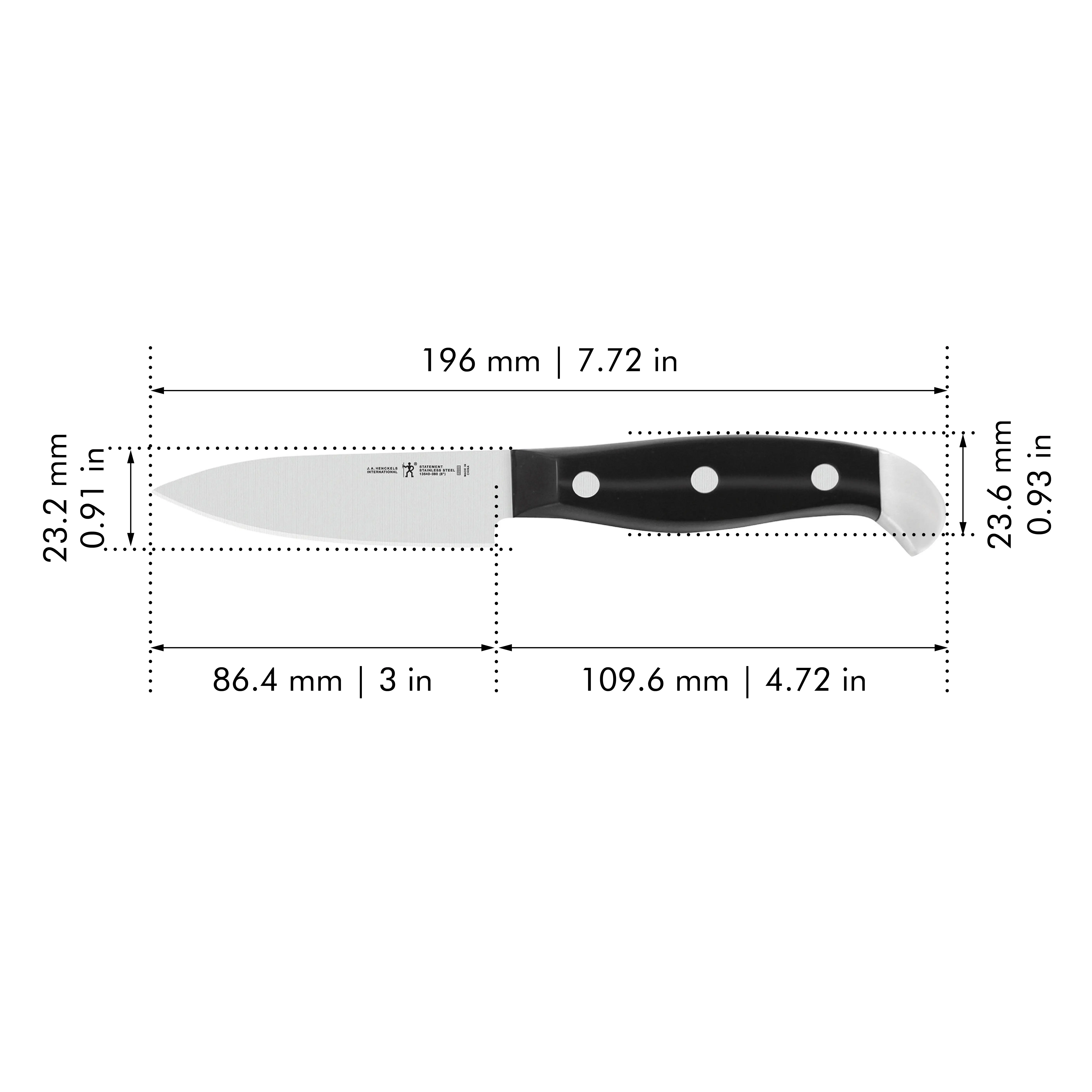 The Henckels Statement 3" Paring Knife is perfect for tackling detailed kitchen tasks with ease. Honed for long-lasting sharpness, the fine-edge blade boasts precision cutting. Peel potatoes, remove blemishes, and create beautiful garnishes with this small, versatile knife.Fabricated from durable, high-quality stainless steel, Statement's single-piece, stamped blade construction is lighter than forged knives. Along with the full tang, this encourages maximum maneuverability. The traditional triple-rivet handles are curved for comfort and balance while the stainless steel endcap adds aesthetic appeal to your block display. Each time you cook, you will want to reach for this useful knife set.Henckels makes essential kitchen tools every home chef needs. From steak knives to spatulas, each product boasts high quality at an exceptional value. Created in 1895 by Zwilling J.A. Henckels, this value-driven brand guarantees the same durability, design and ease of use for which the global company is known. Equip your kitchen with expertise with Henckels.