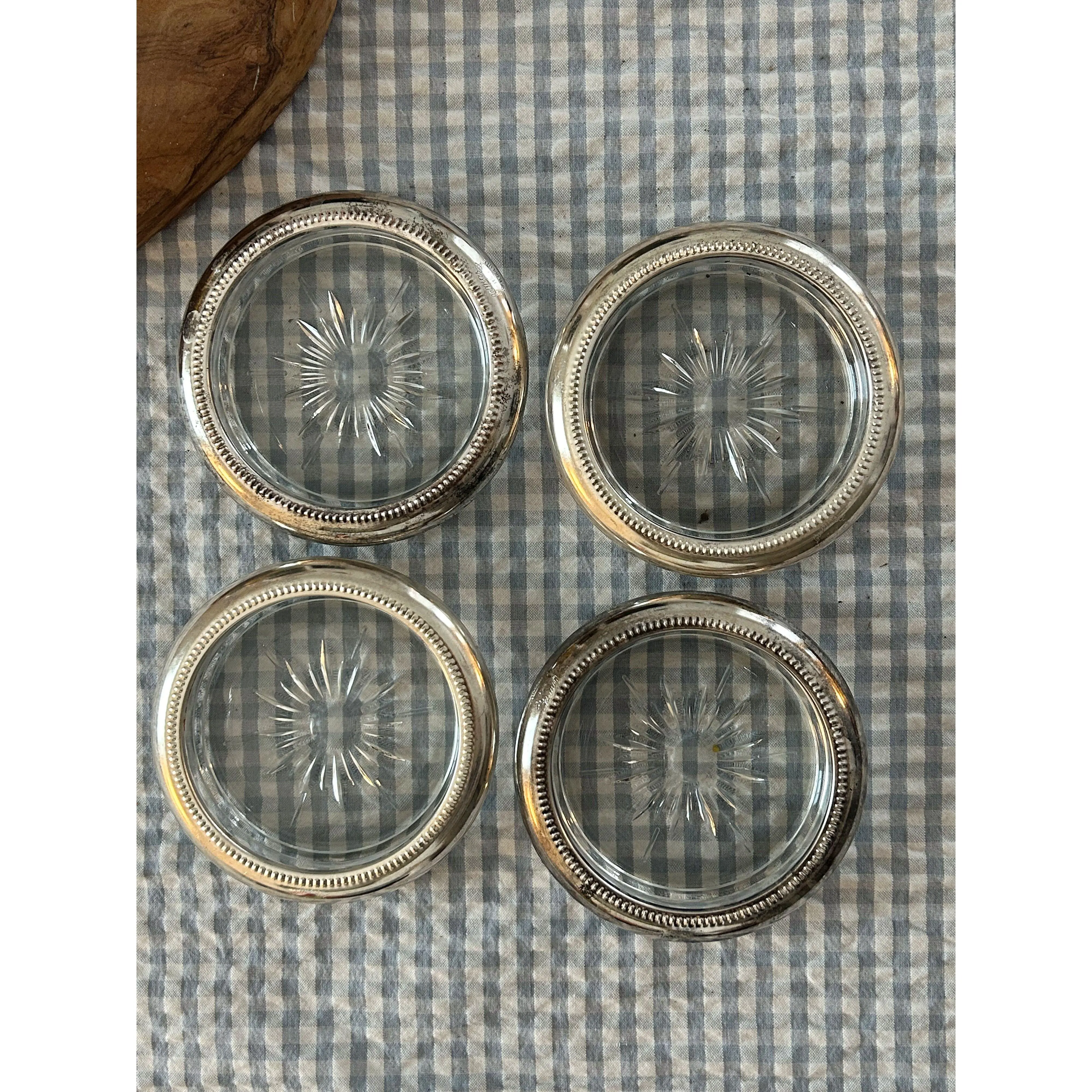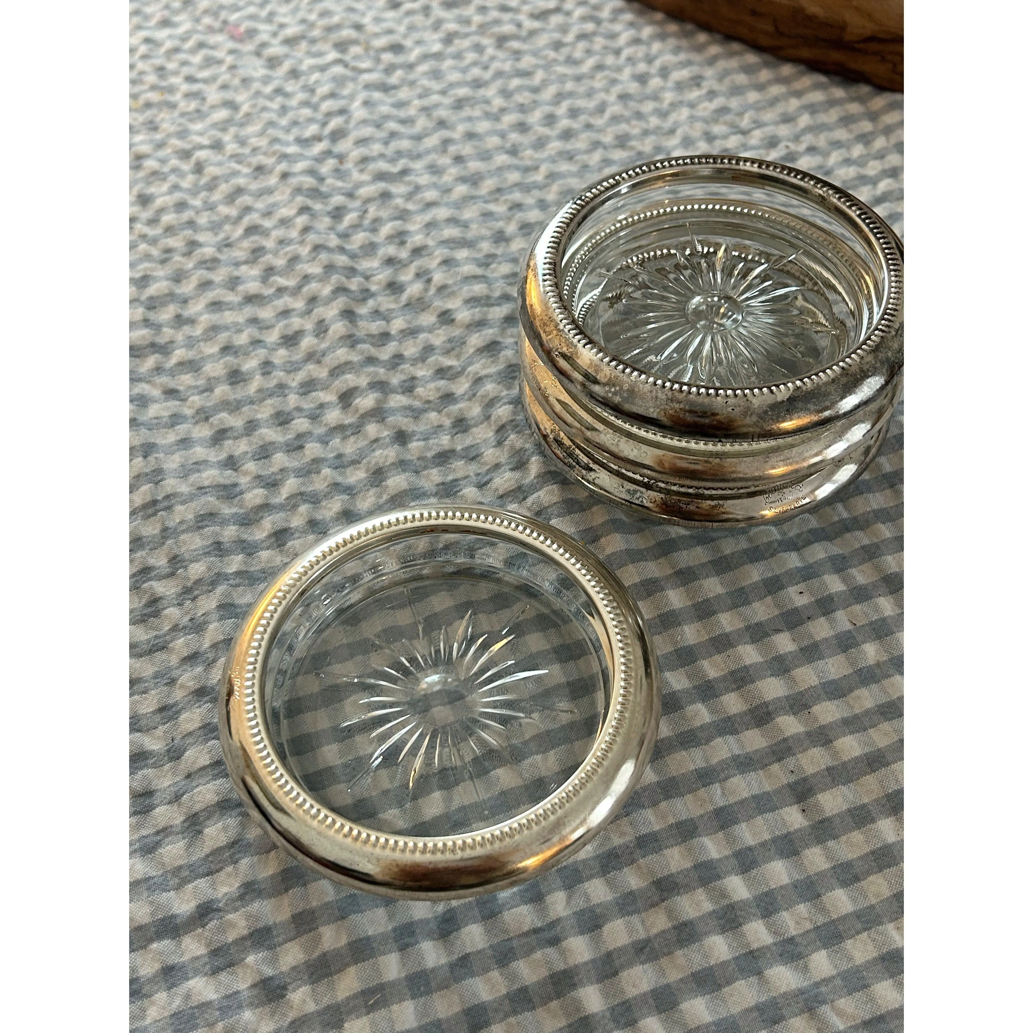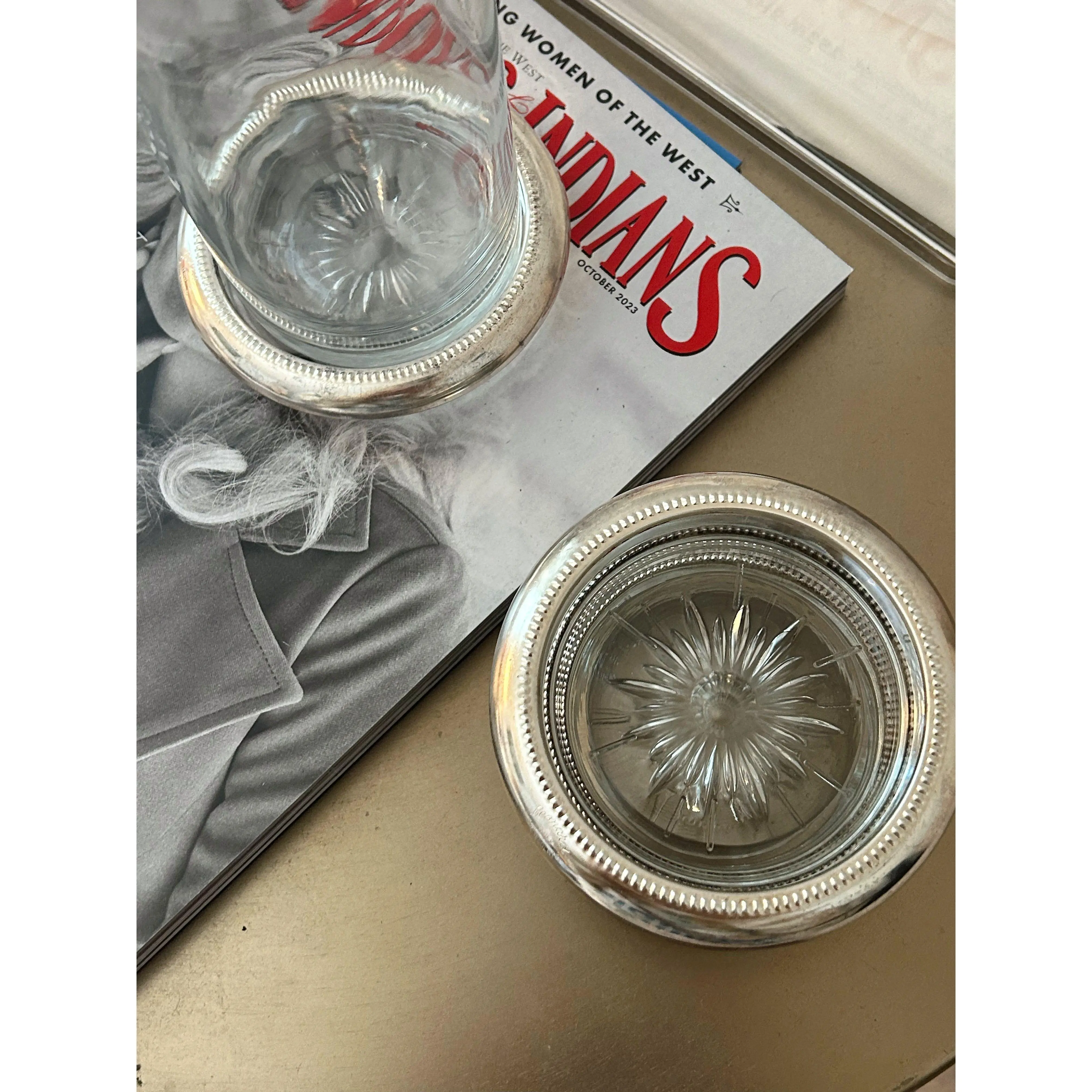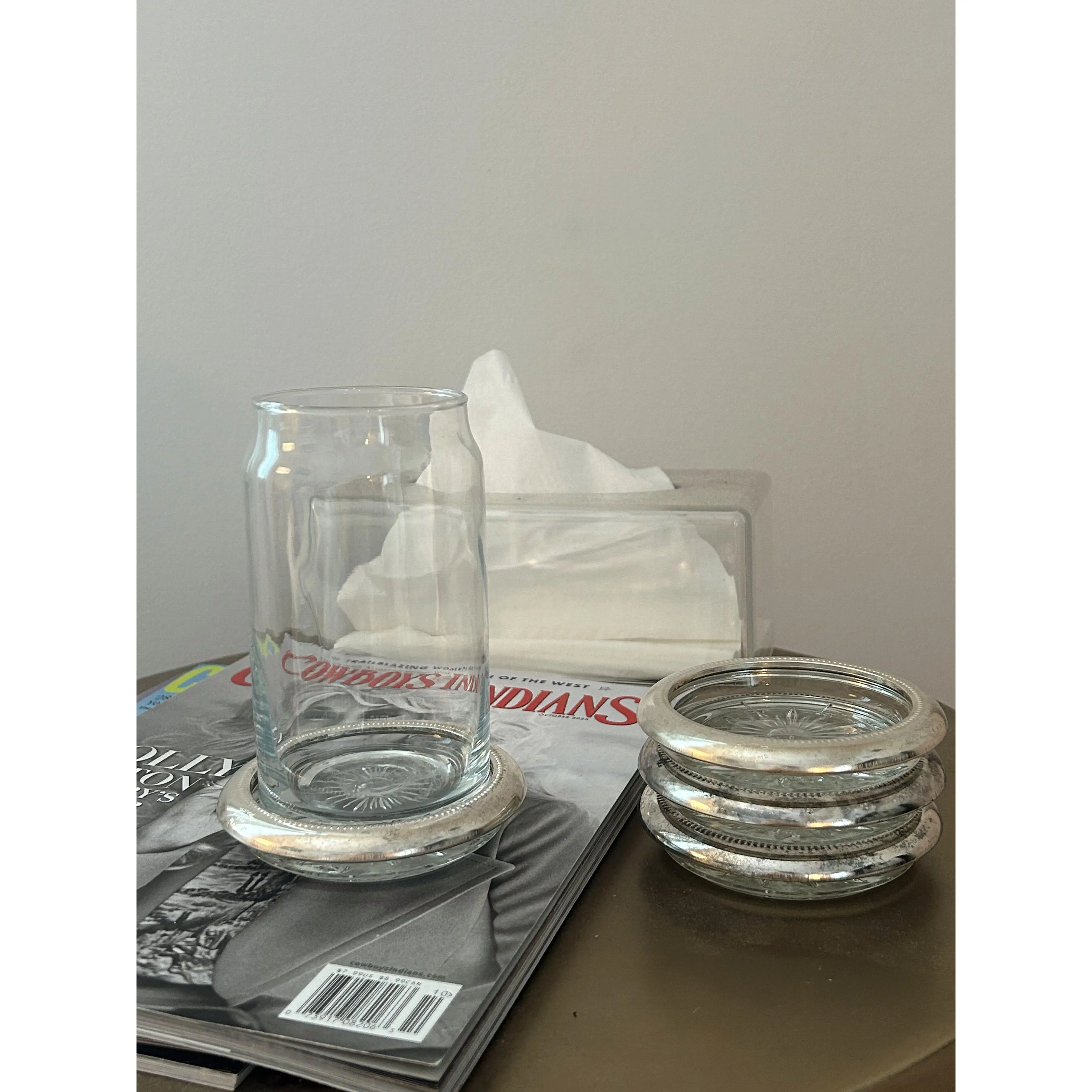 Add some warmth and charm to your space with our Antique Silver & Glass Coaster Set. Made of real sterling silver and glass, these coasters not only provide protection for your furniture but also add a touch of elegance to any room. The nesting feature allows for easy storage, making it a practical and stylish choice for your home.