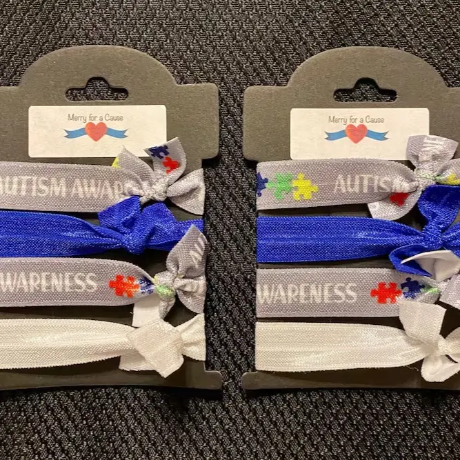 Autism Awareness Hair Ties on a card of 4, featuring hand made awareness hair ties from Merry for a Cause. Each card comes with 4 hair ties, 2 autism awareness hair ties featuring red, yellow, green, and blue puzzle pieces and words “Autism Awareness” and 1 solid blue ribbon and one solid white ribbon.
