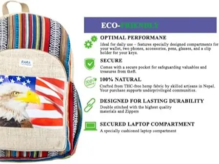 • (FAIR TRADE ITEMS) : Known globally for its fair trade status, this backpack comes in limited colors and designs due to its handmade organic nature. It's a responsible choice for ethical shoppers.