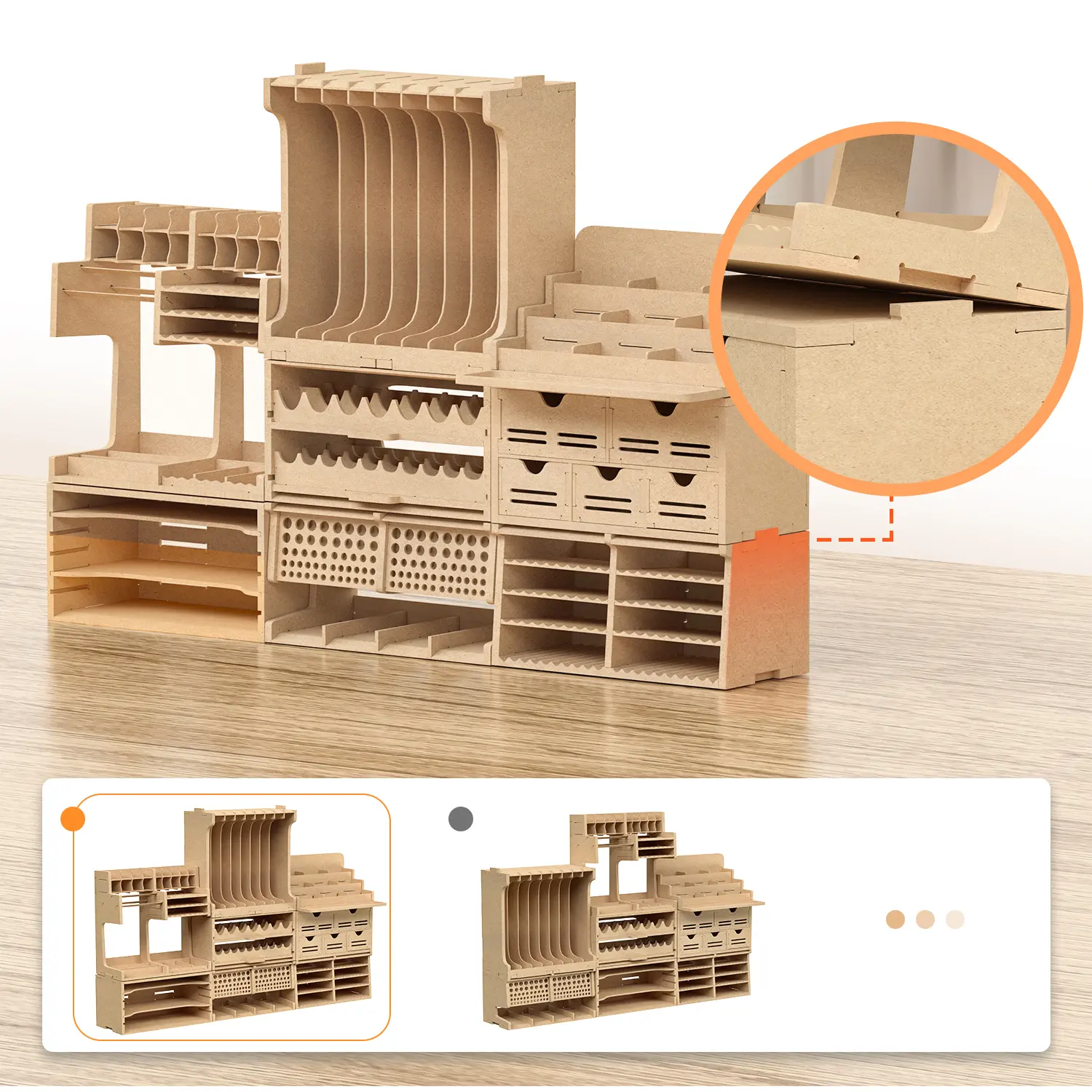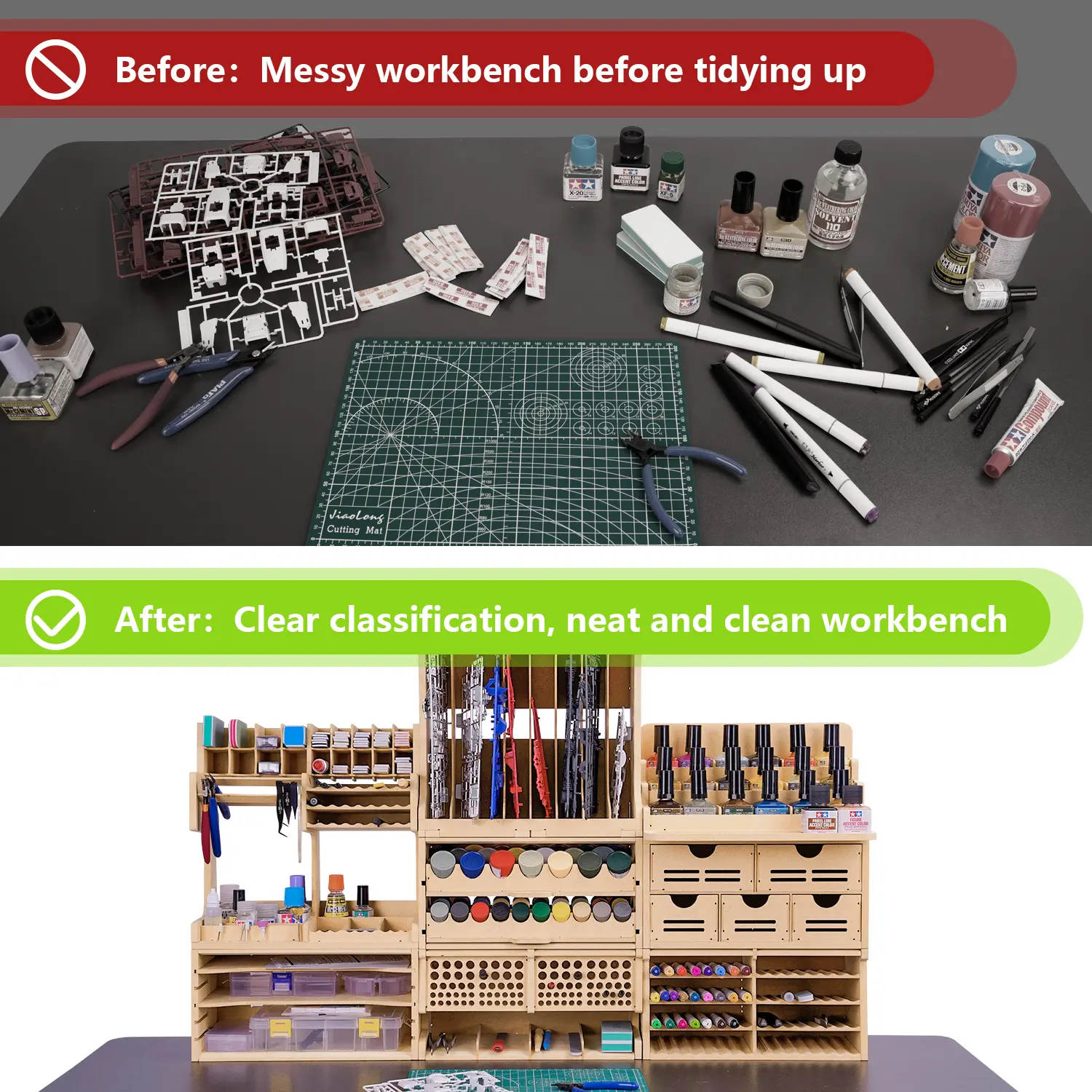 ·【Combined Multifunctional Model Tool Rack】The GK10 model workbench is composed of 8 separate storage racks (GK1-GK8). Including special paint storage rack for storing Tamiya/Junshi paint, and a tool storage rack for storing model making tools , as well as a plate shelf for placing plain groups. Therefore, this storage rack can store all kinds of tools needed for making models, such as Tamiya paints, Vallejo paints, sharp files, accessory cases, nipper stands, pens, brushes, and more!