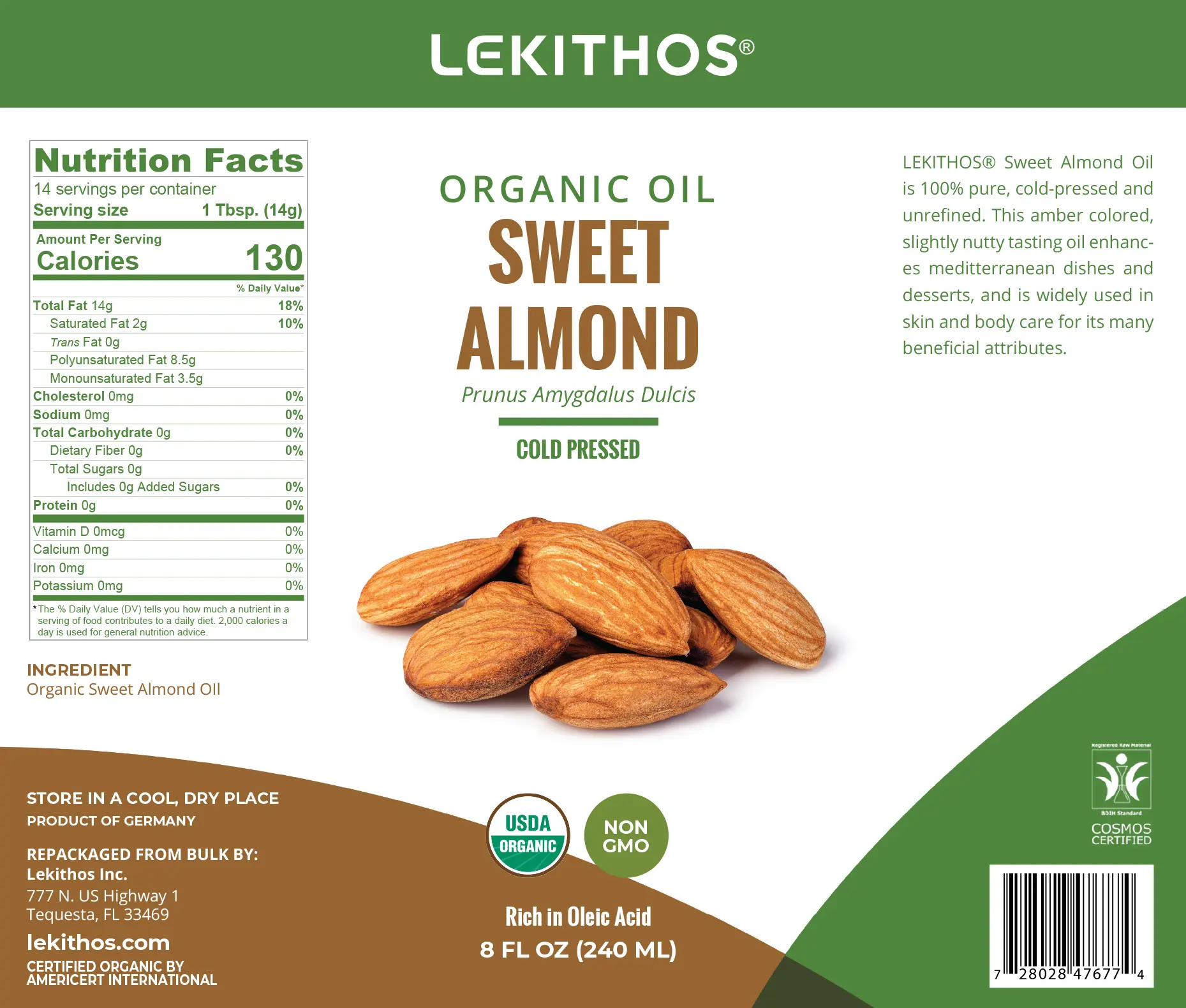 Lekithos Organic Almond Oil is 100% pure, cold-pressed and unrefined. This amber colored slightly nutty tasting oil enhances mediterranean dishes and desserts, and is widely used in skin and body care for its many beneficial attributes.