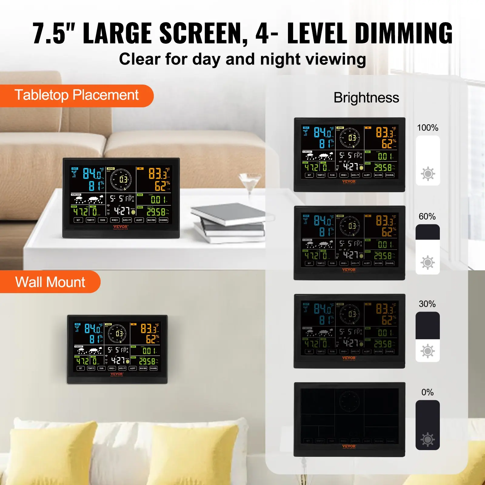 The solar powered weather station is built with a 7.5-inch large screen, displaying weather forecasts and meteorological data more clearly. It comes with a 4-level backlight brightness to adapt to different environments during the day and night.