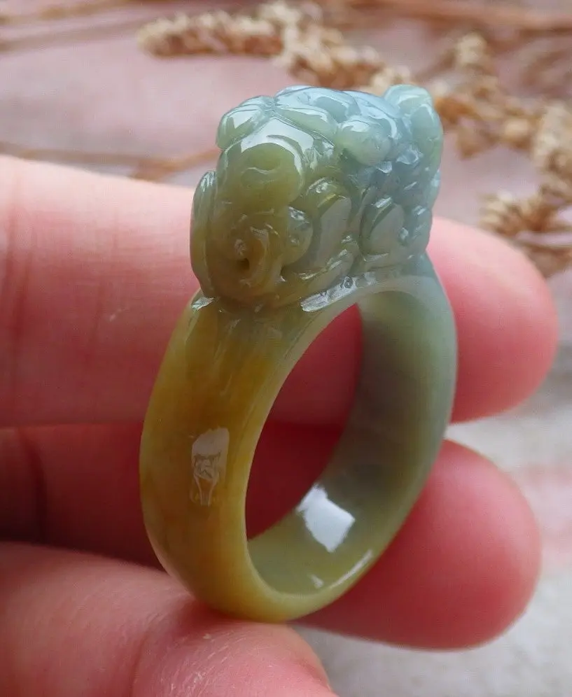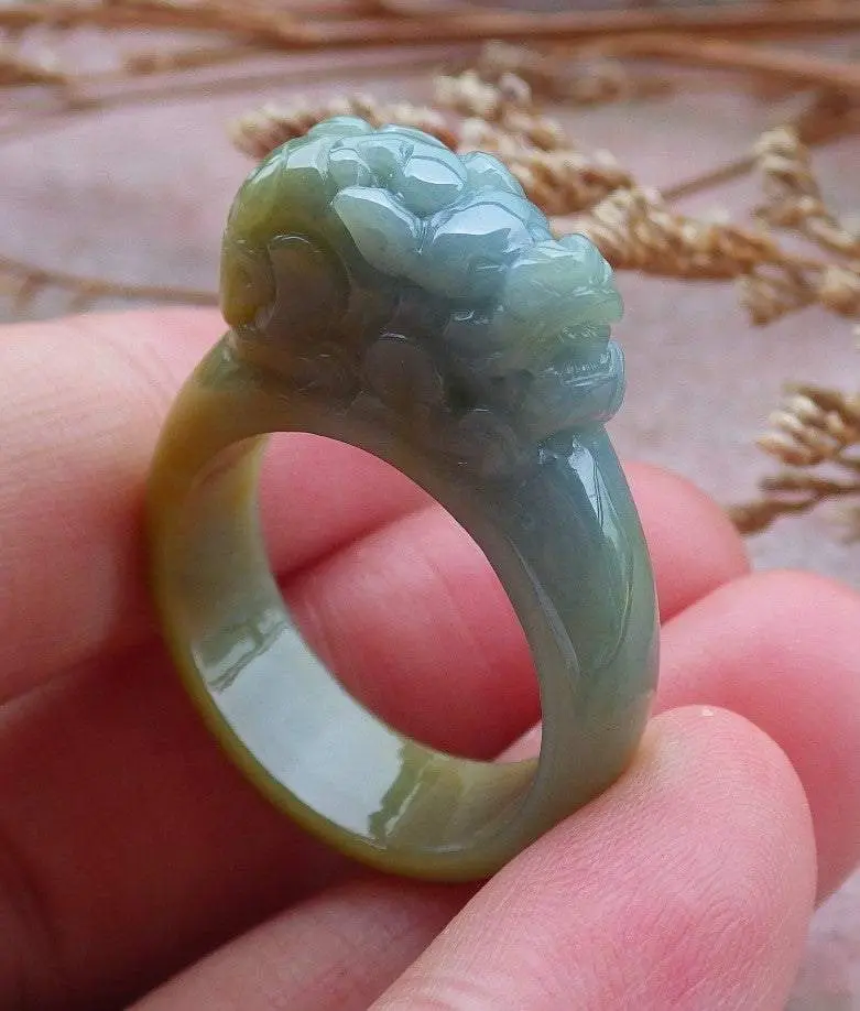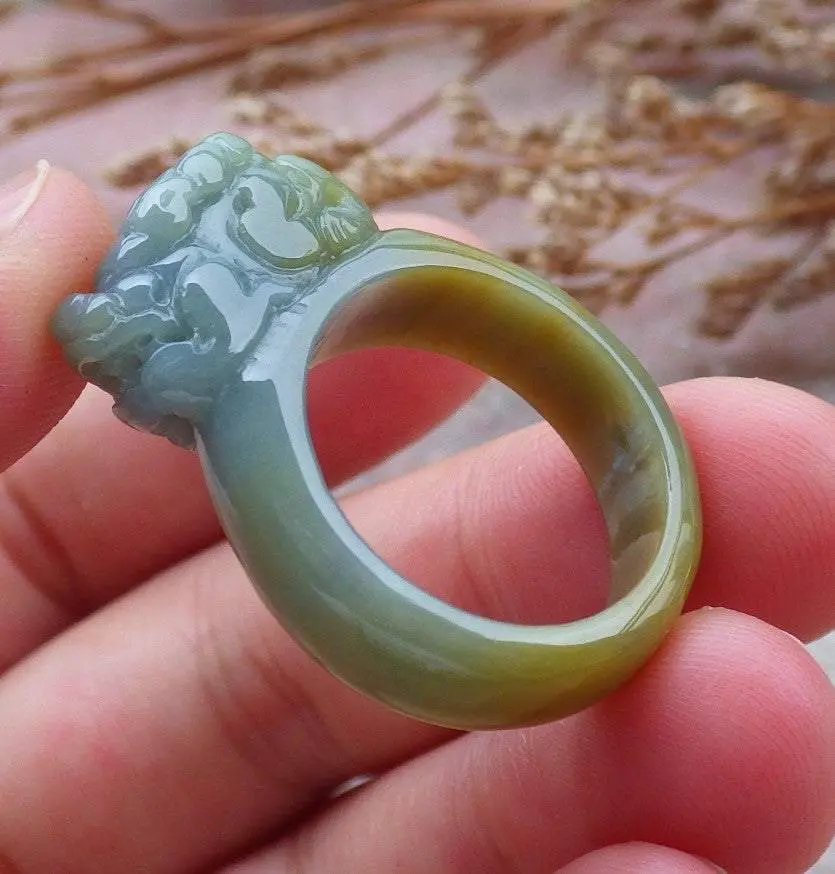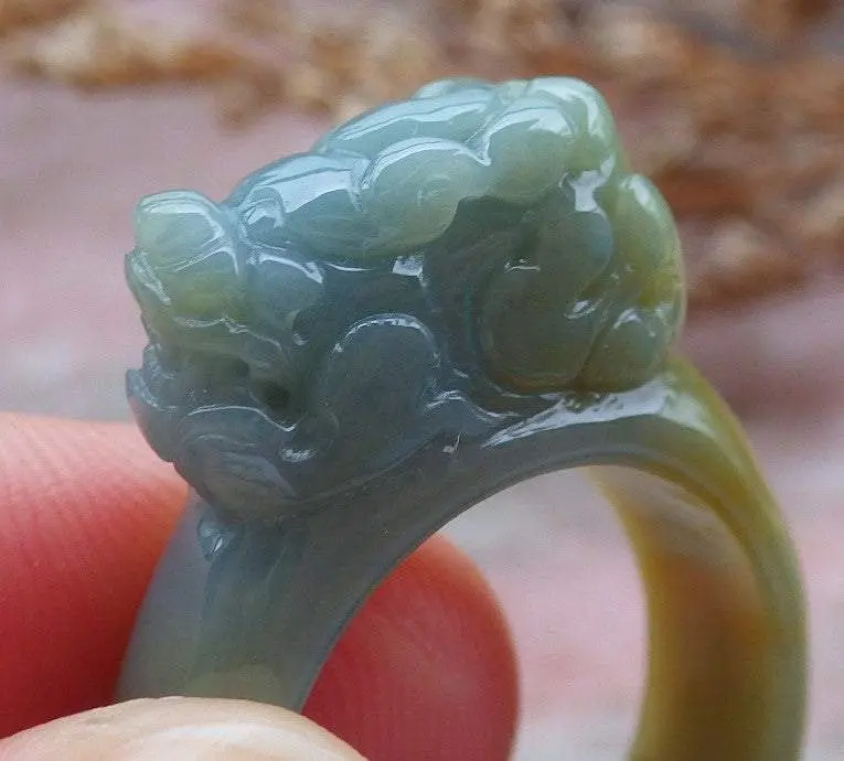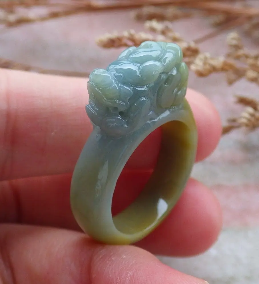 Certified Hand Carved Blue Water Green Yellow Natural Myanmar Burma A JADE Jadeite Dragon Pi Xiu Ring US 8.75