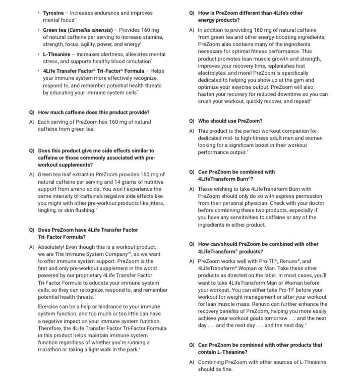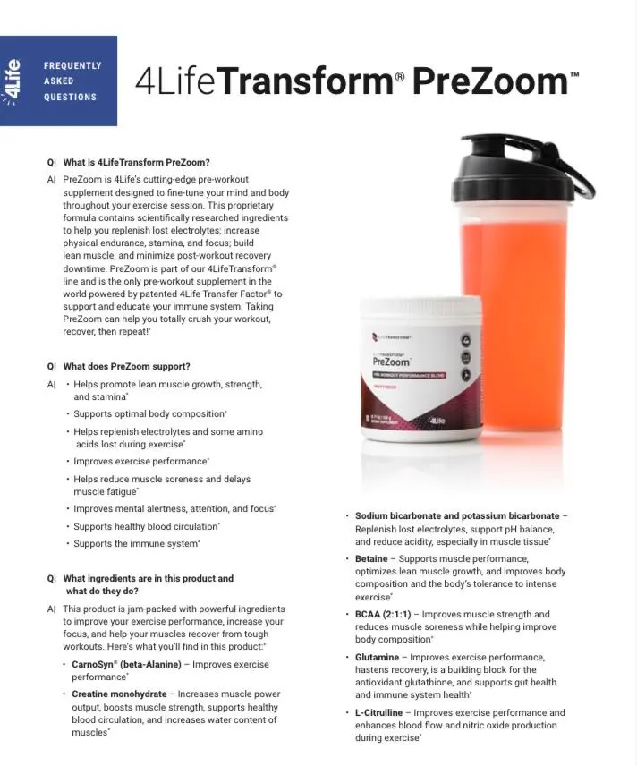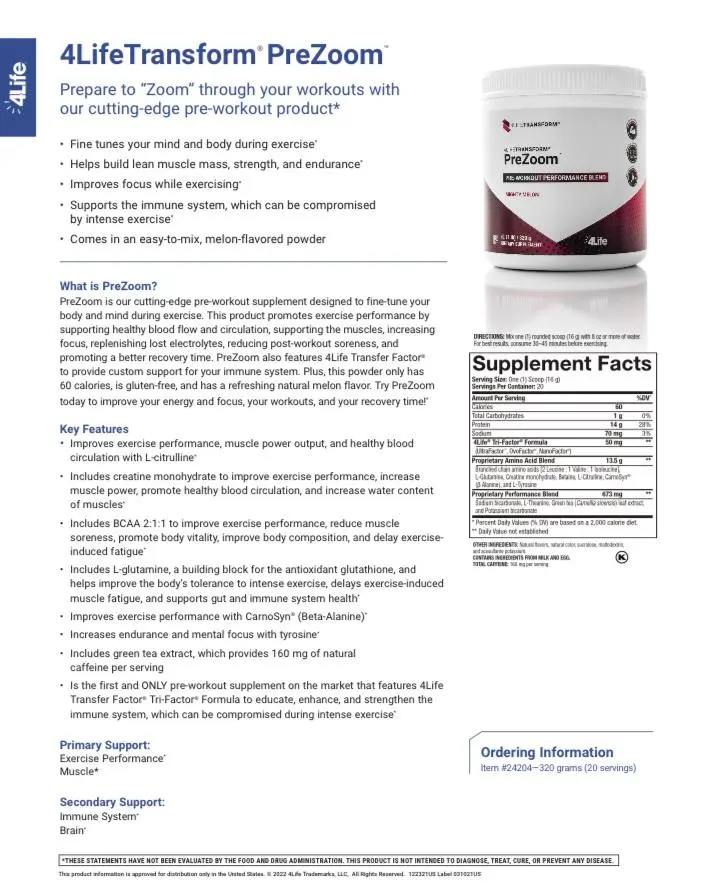 ·creatine and 14g of protein in a preworkout! This formula is the perfect workout companion for adult men and women who want to support energy, physical stamina and endurance, focus, lean muscle mass, and efficient post-workout recovery. PreZoom is the first and only pre-workout supplement in the world that features 4Life Transfer Factor Tri-Factor Formula to help your immune system more effectively recognize, respond to, and remember potential health threats.The green tea leaf extract in PreZoom provides 160 mg of natural caffeine per serving. You won’t experience the same intensity of caffeine’s negative side effects like you might with other pre-workout products like jitters, tingling, or skin flushing.*4LifeTransform PreZoom will help you crush your workout, recover, and repeat! Plus, it comes in a delicious, natural melon flavor!*