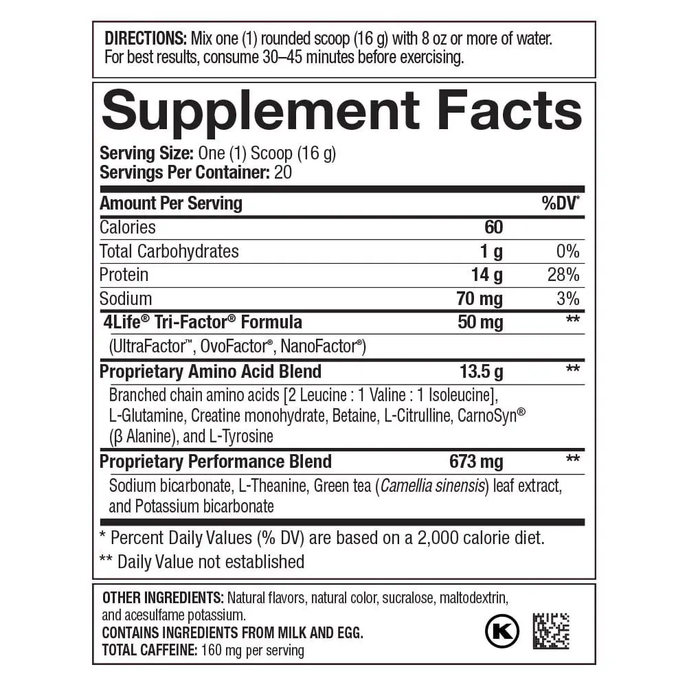 ·Features and Benefits· Improves exercise performance*· Supports healthy blood circulation for an increased muscle pump*· Supports muscle performance while optimizing lean muscle growth, mass, strength, and recovery, while promoting body vitality*· Improves alertness and focus*· Helps delay muscle fatigue and hastens post-workout recovery*· Helps replenish electrolytes and some amino acids lost during exercise*· Educates, enhances, and balances the immune system with 4Life Transfer Factor Tri-Factor Formula*· Provides 160 mg natural caffeine from green tea· Contains 14 g protein· Provides 2:1:1 BCAA as a key ingredient· Is gluten free and only 60 calories per serving!