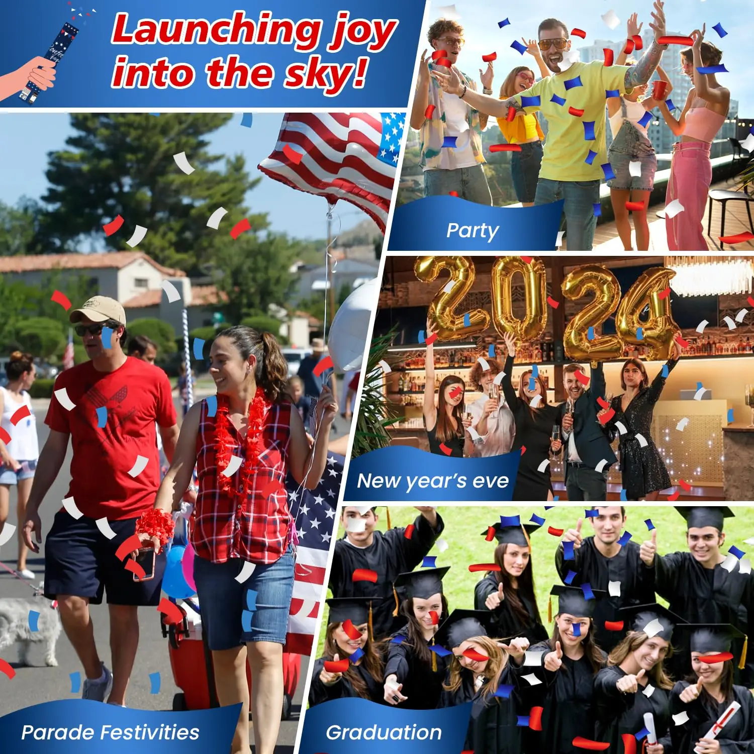 ·【Patriotic Confetti Poppers】Each Red white blue confetti cannon is filled with biodegradable confetti .Turn confetti party popper gently in the direction of rotation at the bottom of the salute, and 4th of july confetti inside will be sprayed out and can be shot 10-15 feet into the air.