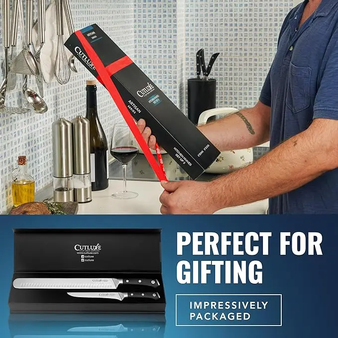 ·RAZOR-SHARP GRANTON BLADE EDGE: Experience premium performance with razor-sharp granton blades on both knives, reducing friction and preventing meat from sticking, making slicing effortless.
