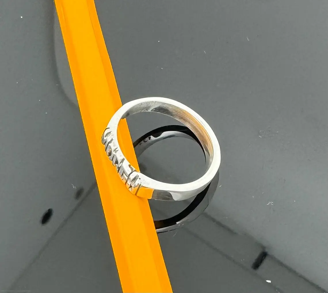 All our rings are made by hand from raw minerals, they are made specifically for our shop. They come all the way from Mexico and are solid 925 Sterling Silver. All rings are hand pounded into the ring shape and hand filed to create unique rings and therefore there will always be slight differences in measurements. Since each ring is made by hand no two rings will ever be the same. Each ring is uniquely personalized for you. We begin with a blank 925 sterling silver ring, size it to your desired size and with a hand saw carve out the personalization of your choice. We then file down the rough edges, polish your ring and the it is bagged and shipped out to you.
