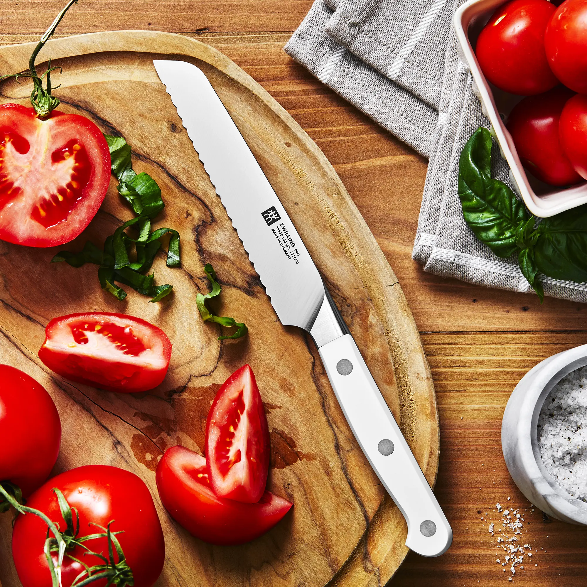 The 5-inch serrated edge utility knife is ideal for cutting bread and slicing through delicate foods. The serrated blade cuts through hard exterior, soft interior foods effortlessly. Cut tomatoes, sausages, bread, and cheese with precision - this small, versatile knife is perfect for picnics, too.