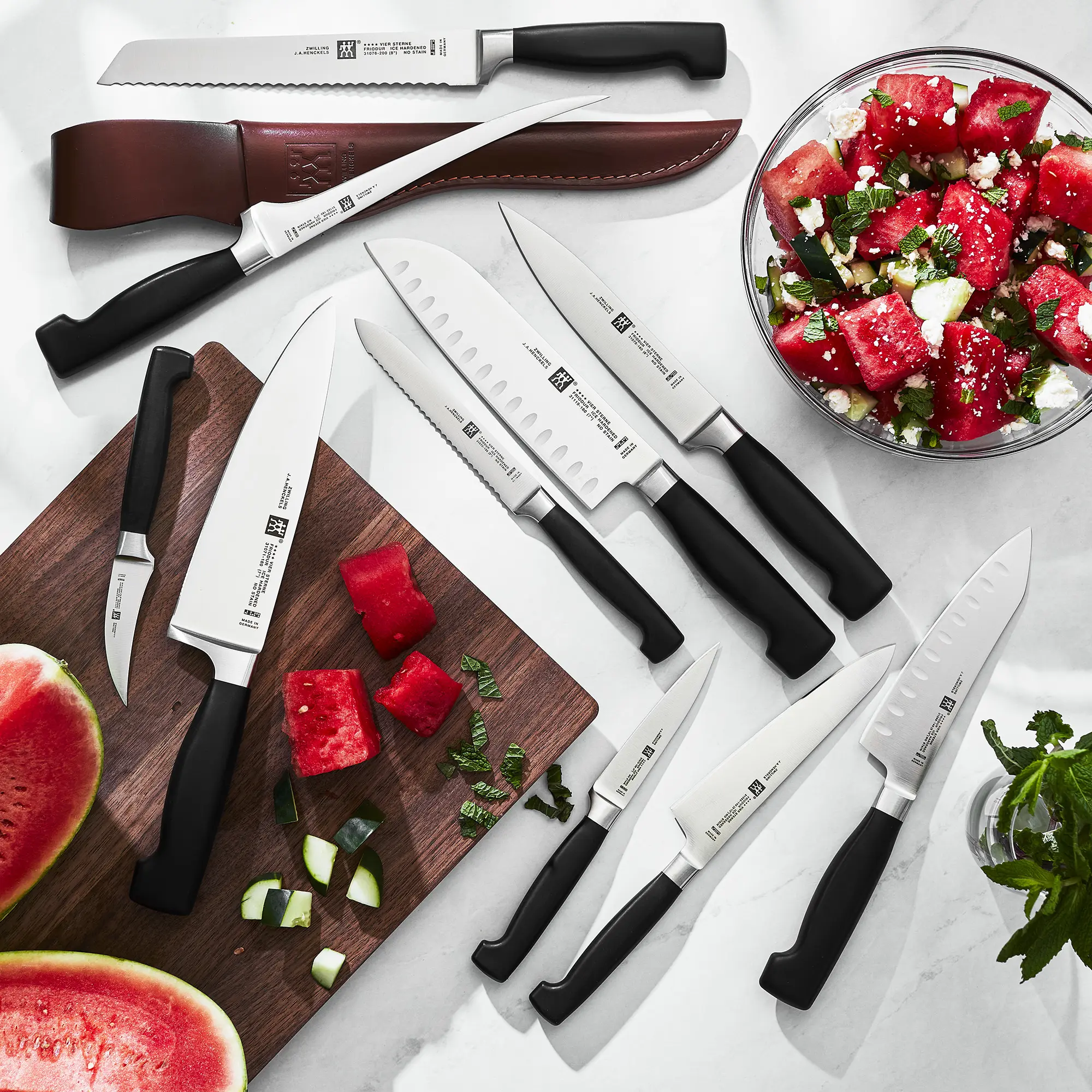 Four Star knives are made of proprietary special formula steel that has been perfected for almost 300 years. Combined with ZWILLING’s signature ice-hardening technique, these FRIODUR blades are harder, sharper, they will not stain or chip, and they retain their sharpness longer. Precision forged from a single piece of steel, the SIGMAFORGE knives have an exceptionally sturdy, balanced, and flexible blade.