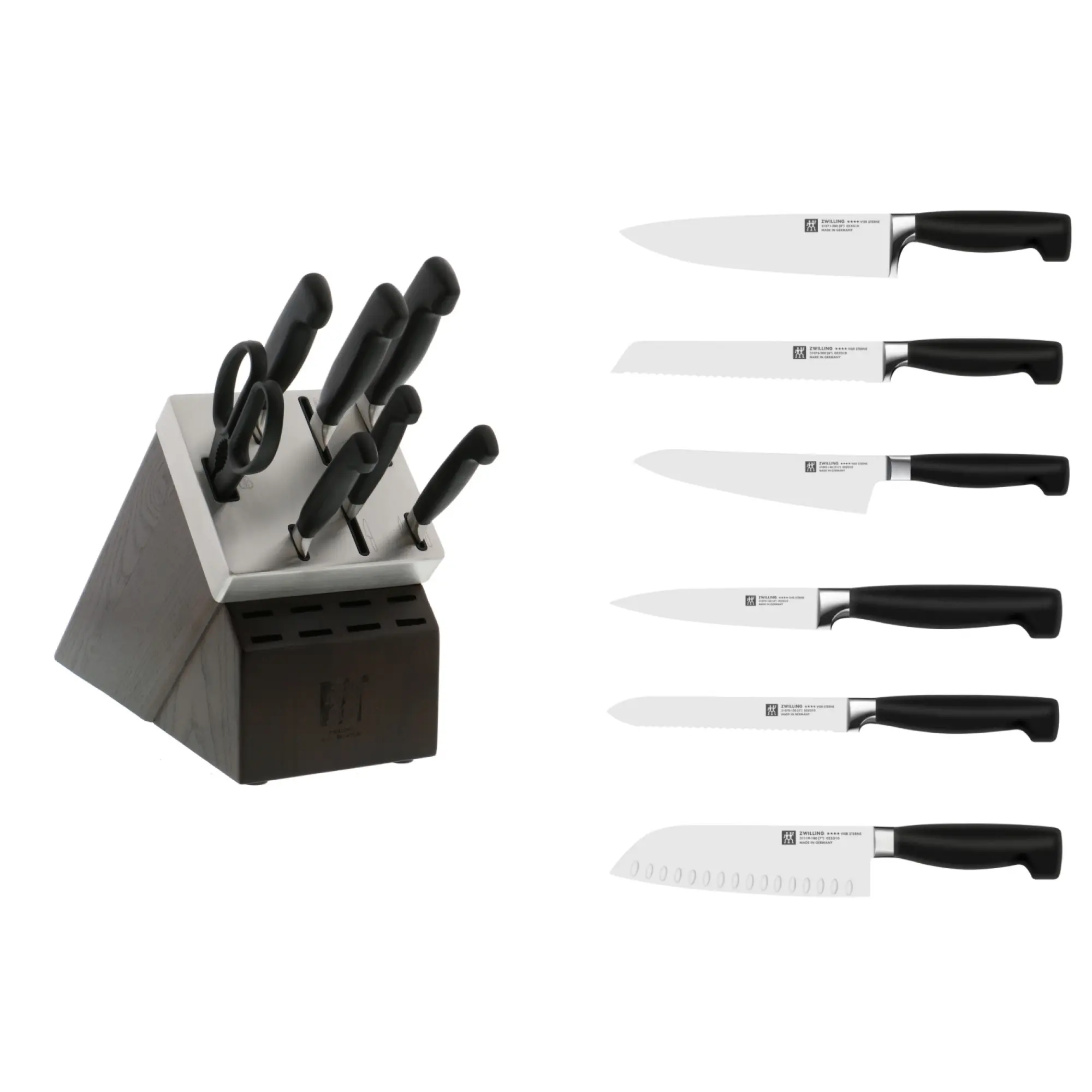 ·Set includes: 4-inch paring, 5.5-inch prep, 5-inch serrated utility, 7-inch hollow edge santoku, 8-inch chef’s, 8-inch bread, kitchen shears, hardwood knife block