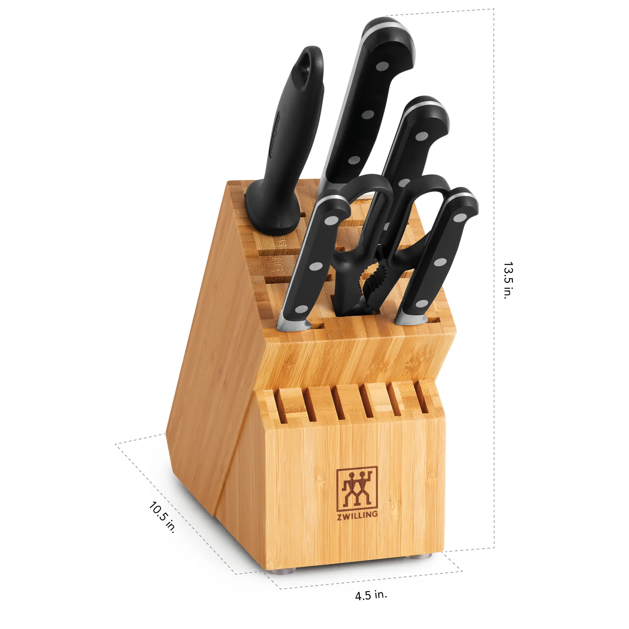 ·4" Parer; 5" Serrated Utility; 5" HE Santoku; 8" Chef's; Kitchen Shears, 9" Sharpening Steel; 10-Slot Birchwood Block