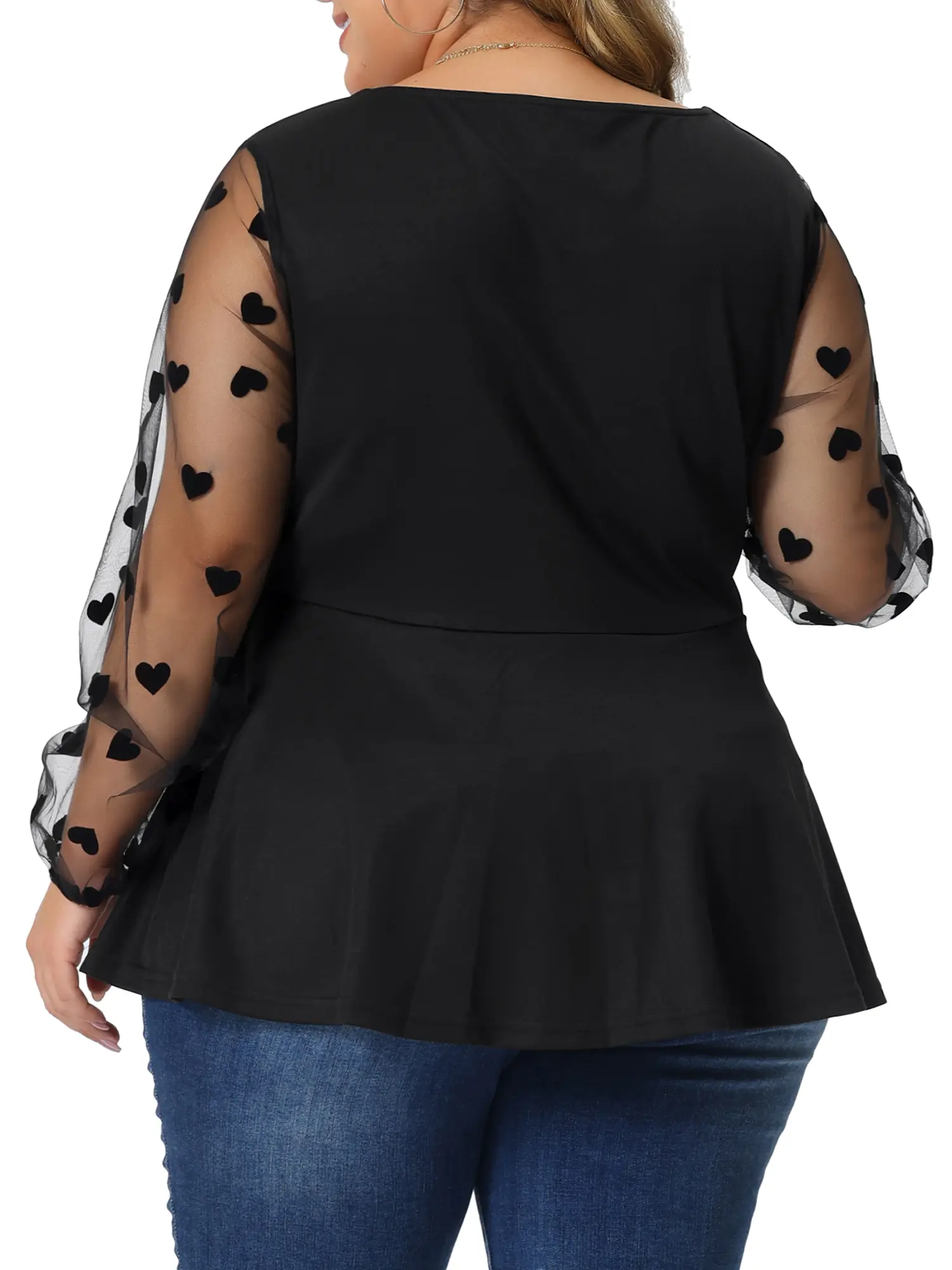 V Neck, Panel Sheer Mesh, Heart Pattern, Long Sleeve, Peplum Tops Blouses