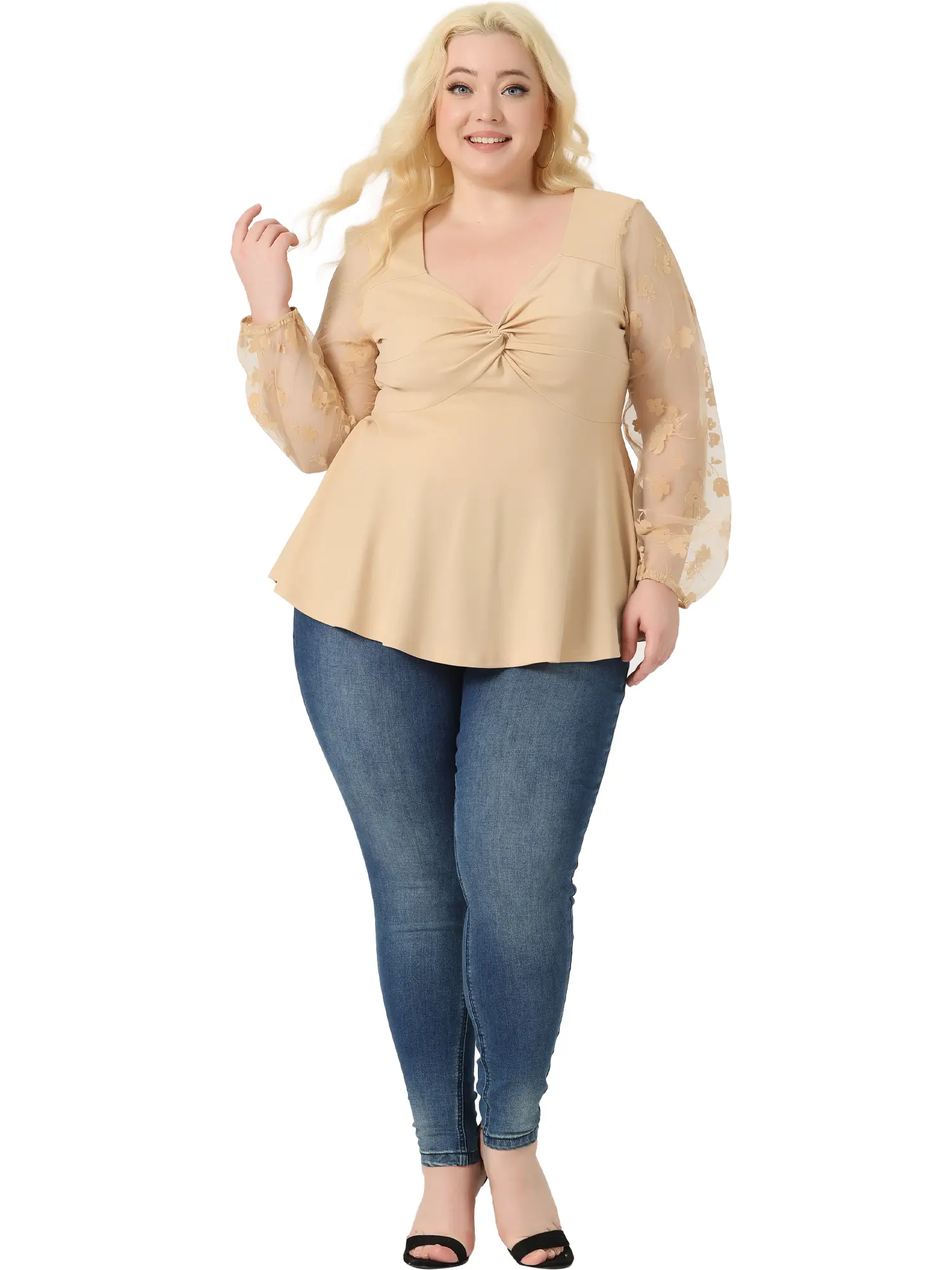Agnes Orinda Plus Size Long Sleeve V Neck Mesh Sheer Peplum Top Babydoll Shirts