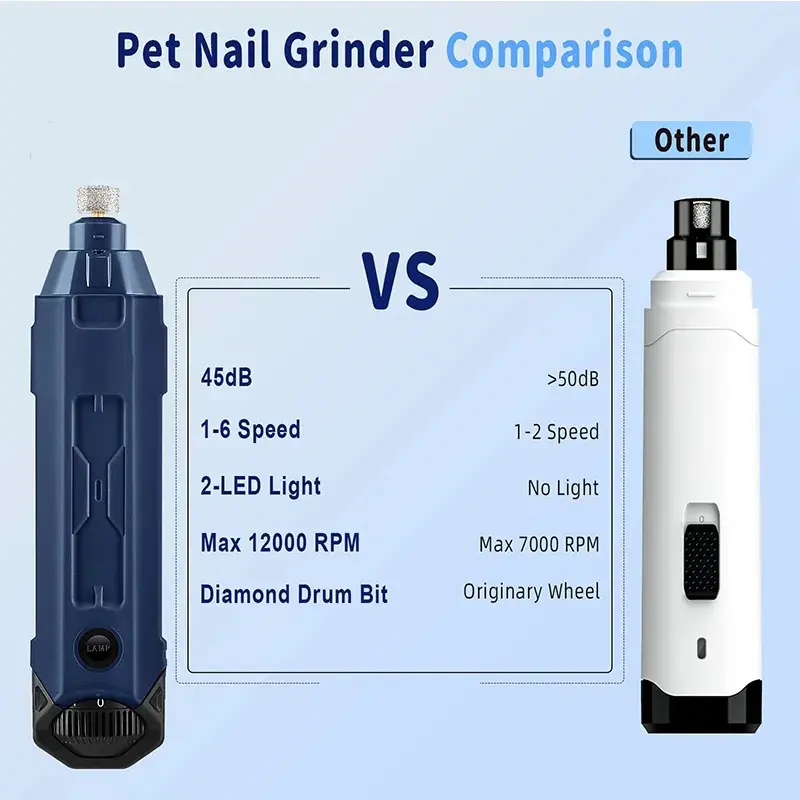 ·Powerful, Ultra-Effective Grinding: Power is the key to effective trimming. Pet nail grinder is outfitted with an innovative motor. The power boosted by 74%. Ensure a fast and effective grinding. And our grinder also uses an advanced diamond drum bit grinder which provides more comfortable and safe pet claw grinding than nail clippers.