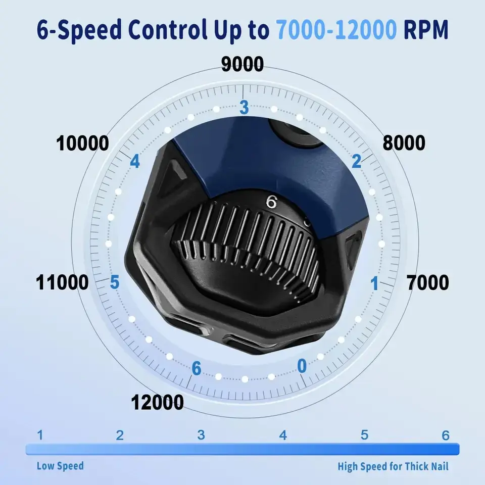 6-speed Variable Controls: Choose between 6 speeds from 7000 rpm to 12000 rpm for a gentle speed for delicate nails or a quicker speed for tougher nails. Engineered for beginners and experts.