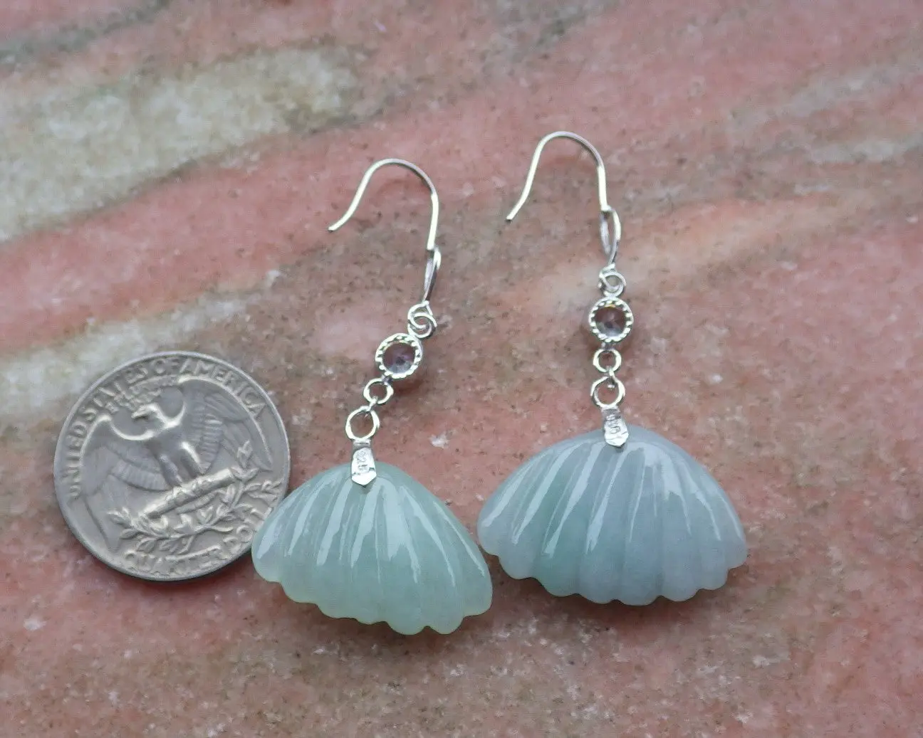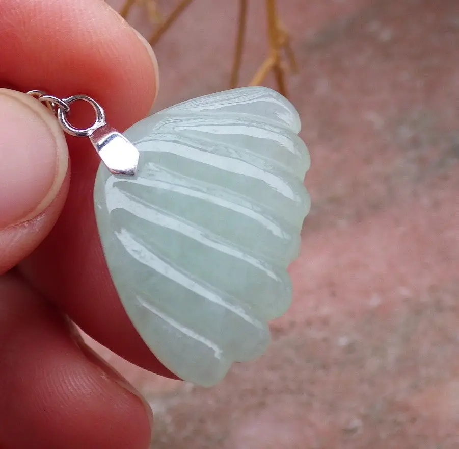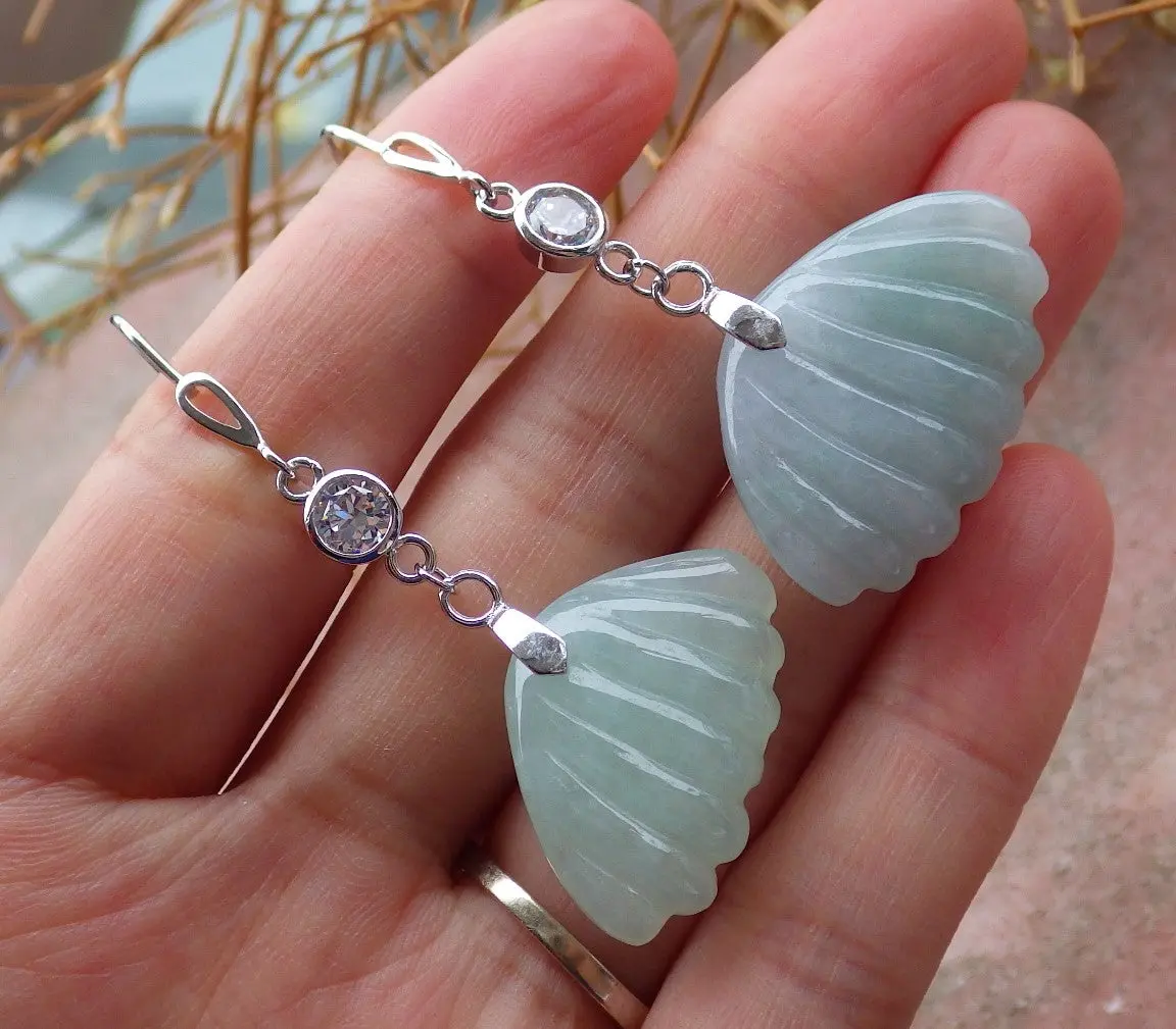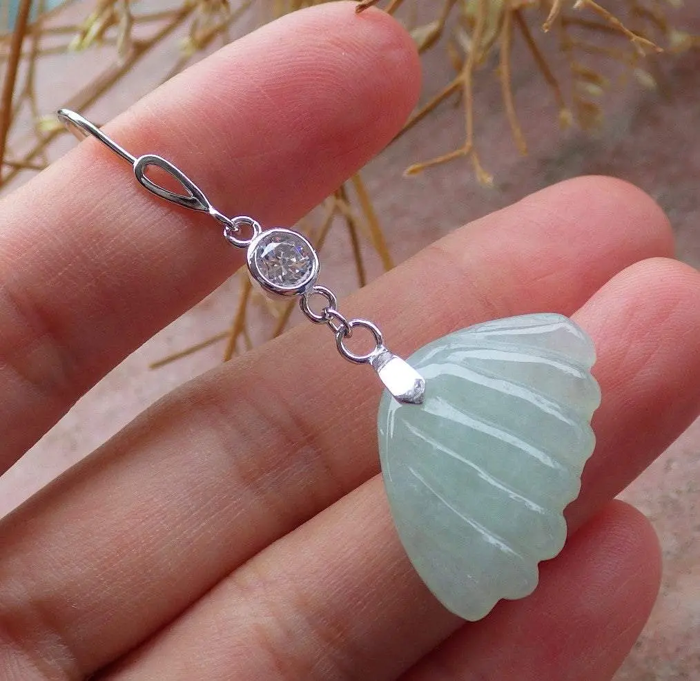 Certified Sterling Silver 925 100% Green Natural Myanmar Burma Hand Carved A Jade Jadeite Sea Shell Dangle Earring Earrings
