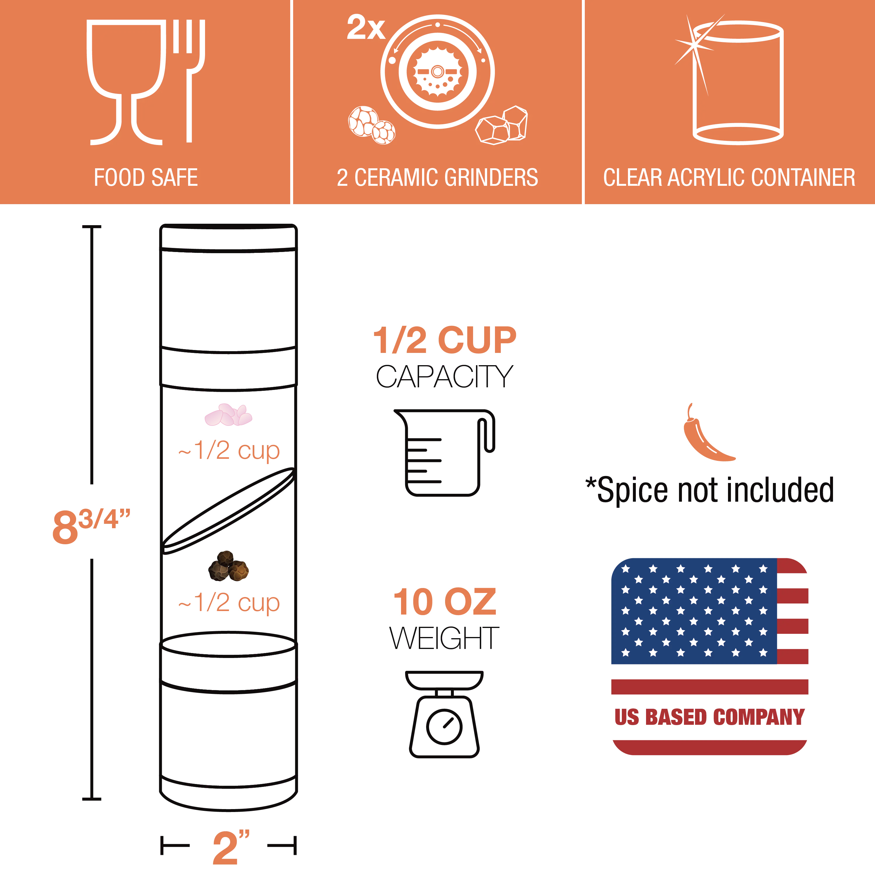 This innovative all-in-one design is ideal for food preparation. Featuring two durable ceramic grinders, you can store your favorite salt and pepper in one mill. Get the perfect degree of fineness by easily twisting a dial on the bottom of each grinder. You will receive one (1) dual mill which measures approximately 2 ½" in diameter and 8 ¾" tall - weighs 10 oz.; Spice not included