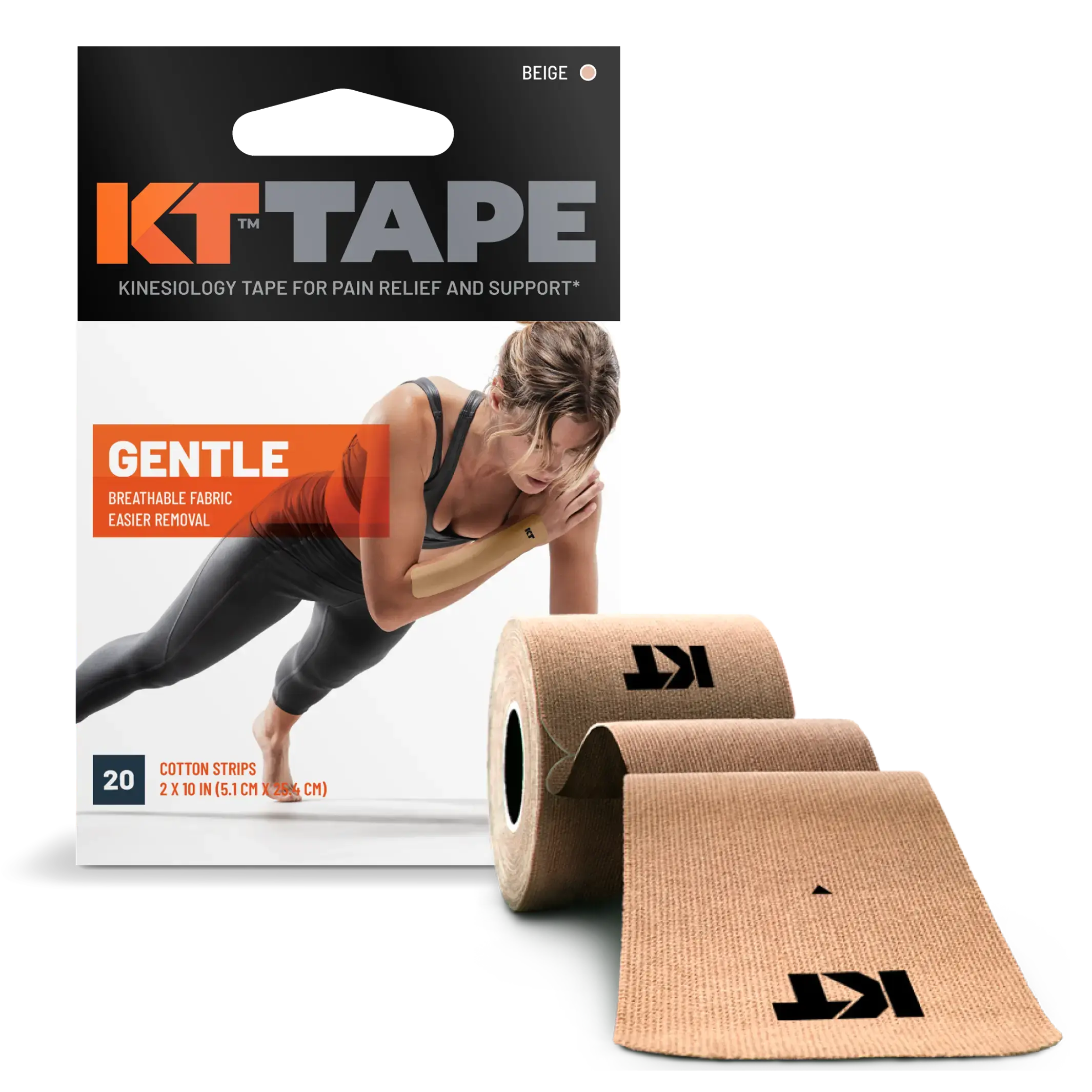 The adhesive in KT Tape® Gentle tape is specially formulated to release more gently from the skin. The KT Tape® elastic core delivers strong support for muscles, joints and tendons without restricting comfort and range of motion. It provides support that can endure lighter workouts, all with an easier release at the end of use. It has been designed to relieve pain and provide support, staying in place for 1-3 days through showers, humidity, cold, and even the pool.