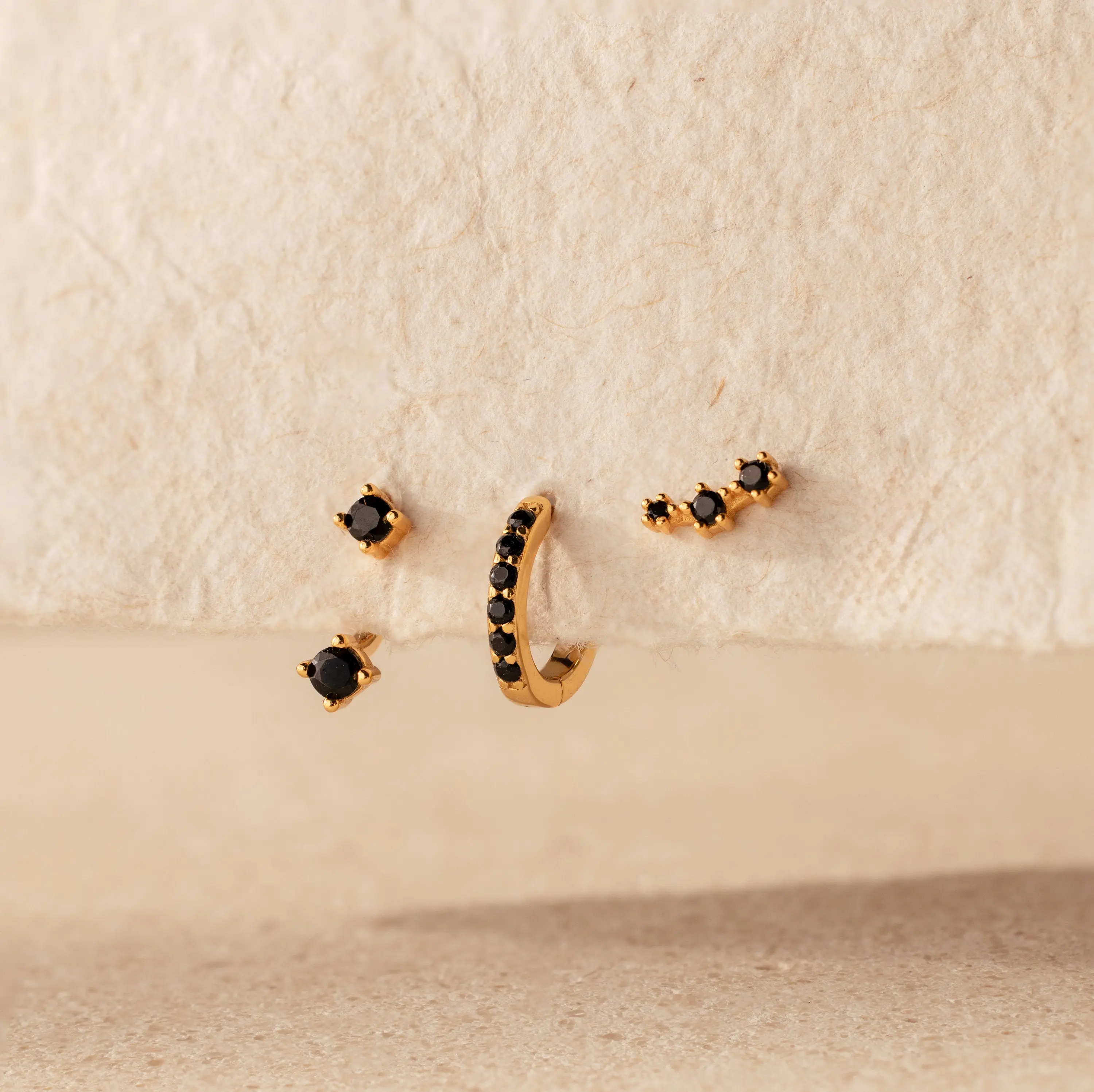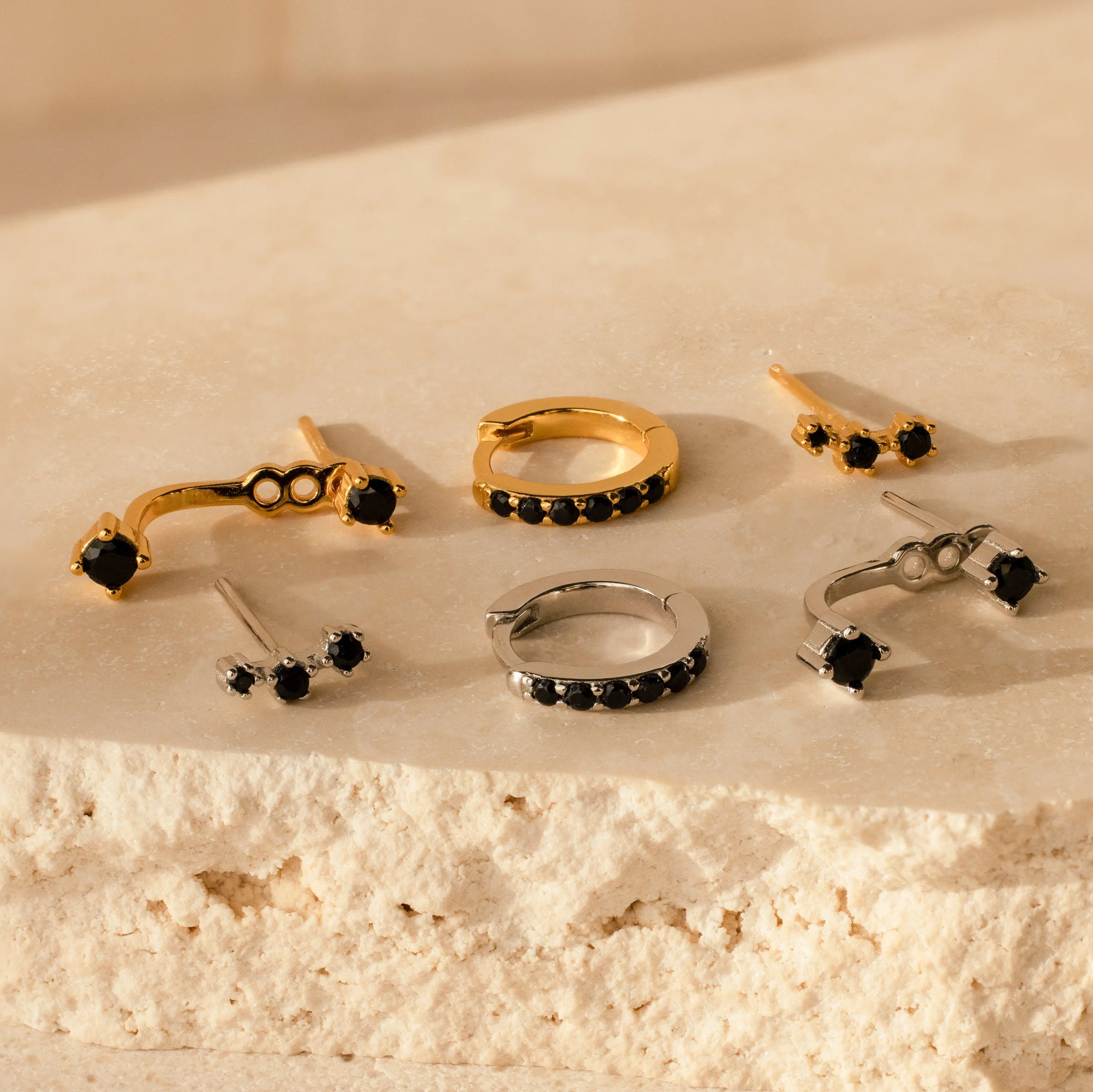 Give her an anniversary gift that she will love and cherish forever. This climber stud earring, gemstone huggie hoop and ear jacket are a classy and elegant set of three black diamond earrings. Treat her to these easily stackable earrings first, and she’ll wear them to your dinner reservations later.