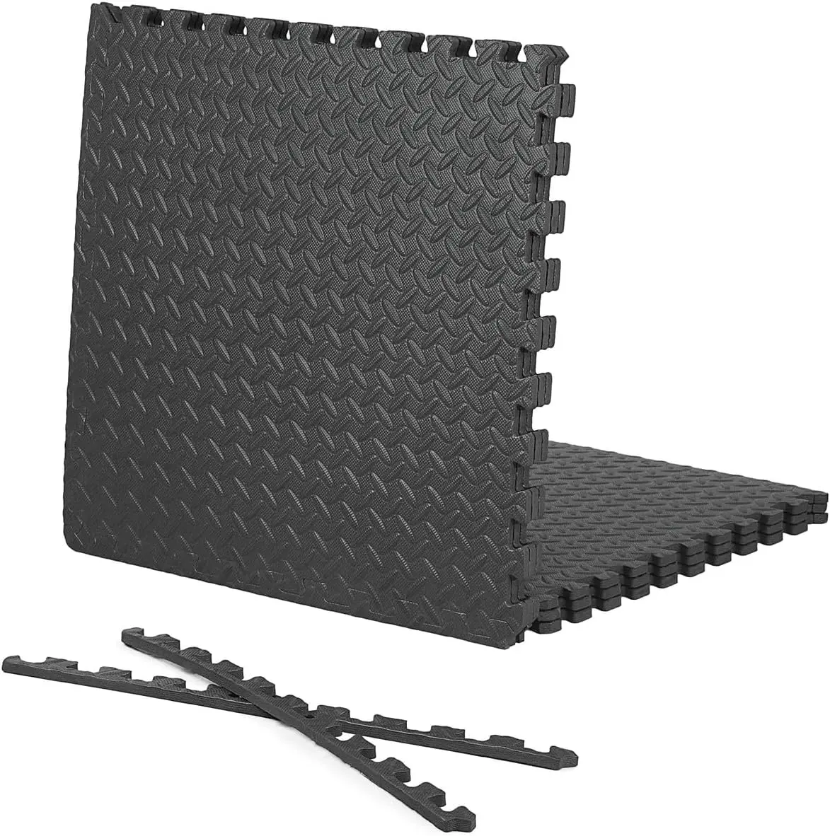 💪Cover 24 SQ.FT. - 6 tiles (24'' x 24'' x 1/2'') diamond pattern Eva foam floor mats Interlock together covers approx. 24 square feet of the floor area, perfect space for gym equipment or workout on it, and also safe for kids as playground.