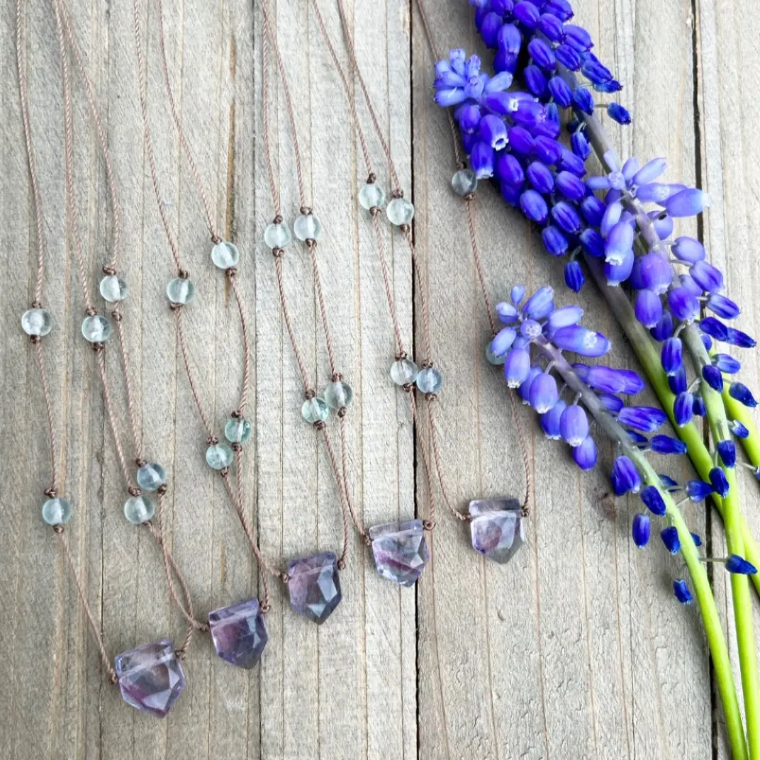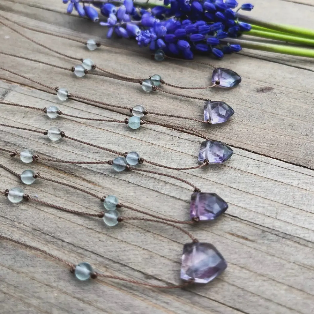 small faceted fluorite shields (varying shades with mostly purple), small green fluorite round beads, hand-knotted light brown cord (heat set delicate nylon thread with strong durability and resistance to fraying), sterling silver or 14kt gold filled findings