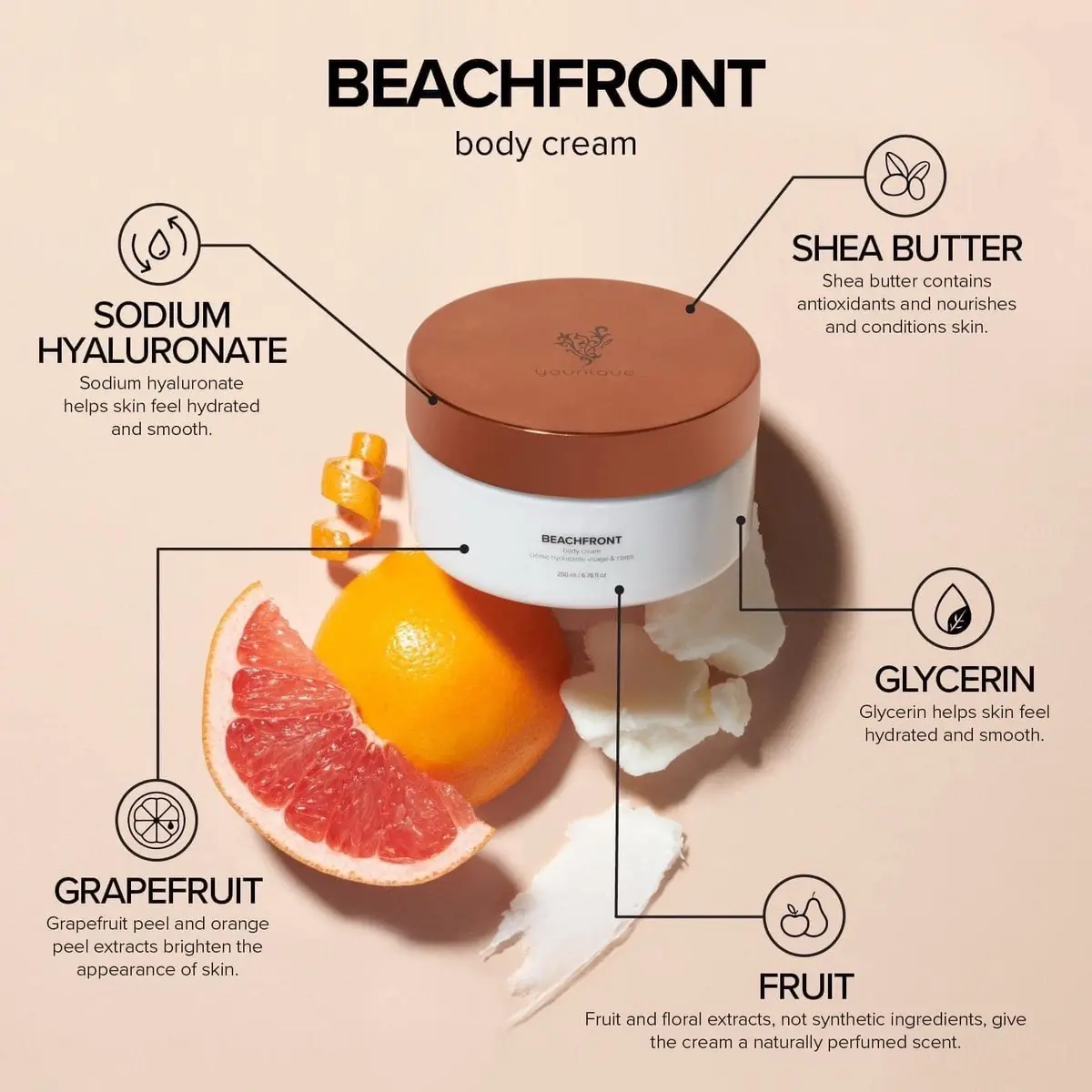 Shea Butter,Sodium Hyaluronate and Glycerin,help skin feel hydrated and smooth thanks to their water retention properties.,contains antioxidants and is known to nourish and condition the skin.,Grapefruit Peel and Orange Peel Extracts,work together to help brighten the appearance of skin.