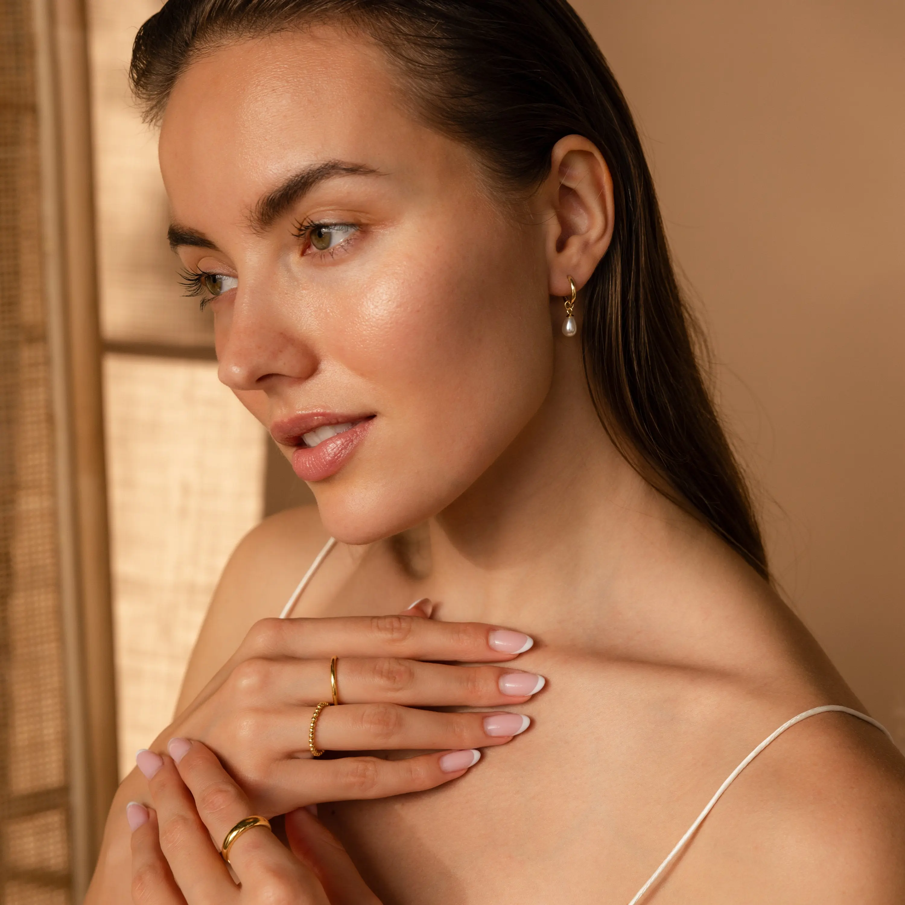 ·Featured Styles: Model showcases a delicate, golden minimalist style featuring Minimal Stacking Ring, Beaded Ring, Duo Form Ring Set.