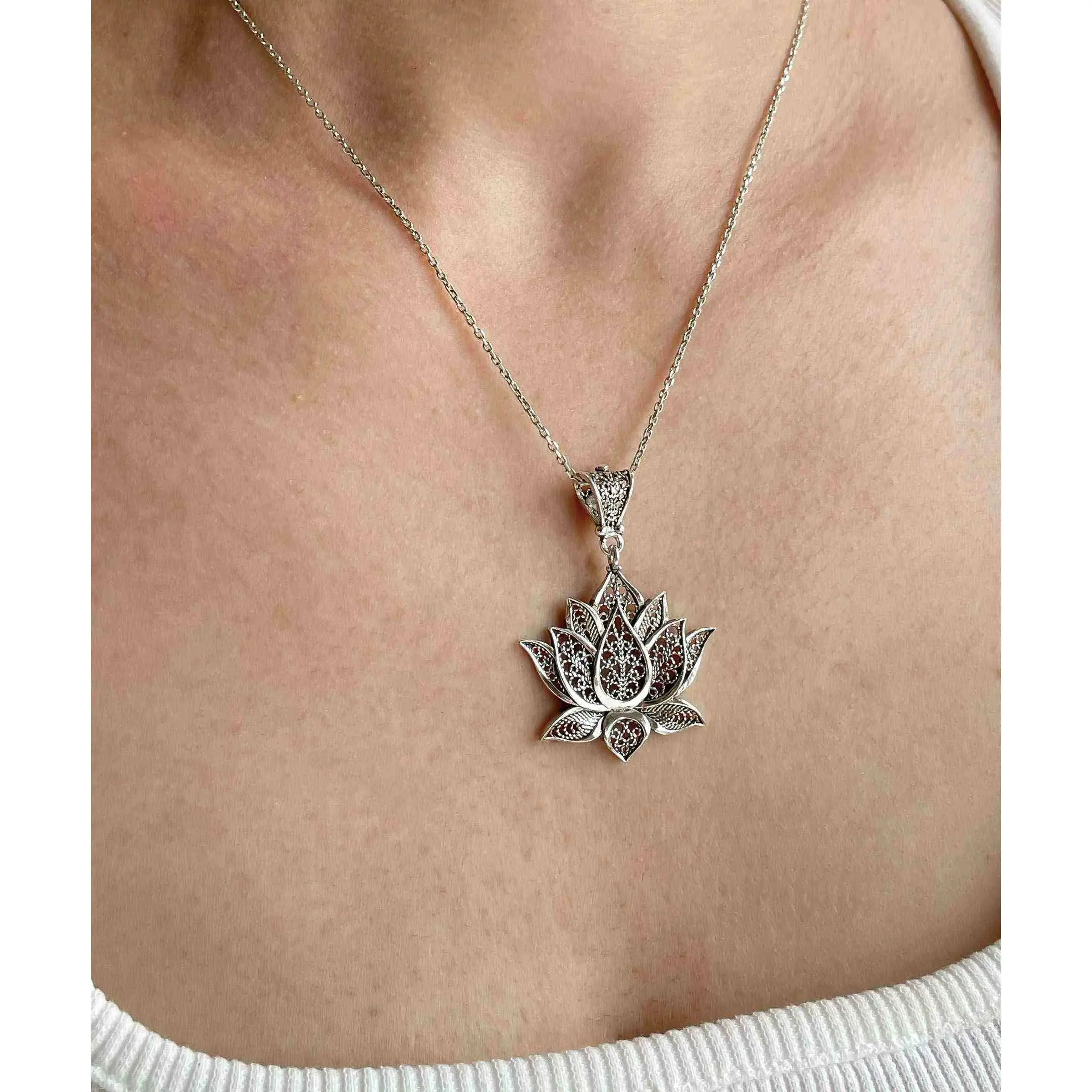 Introducing our stunning handcrafted filigree art lotus flower pendant necklace, perfect for adding a touch of elegance and sophistication to any outfit. The intricate detailing of the lotus flower, a symbol of purity and enlightenment, is showcased beautifully in this piece.