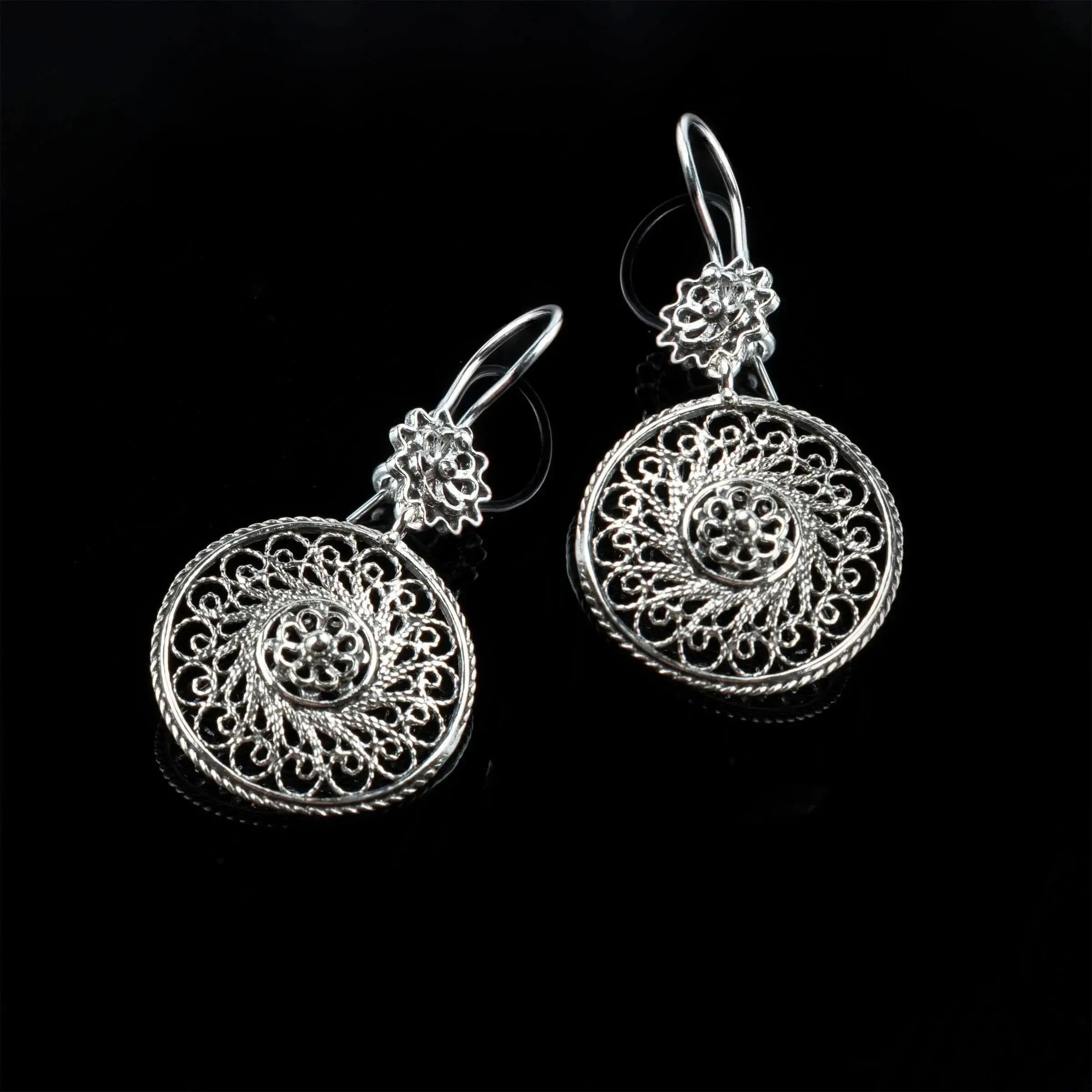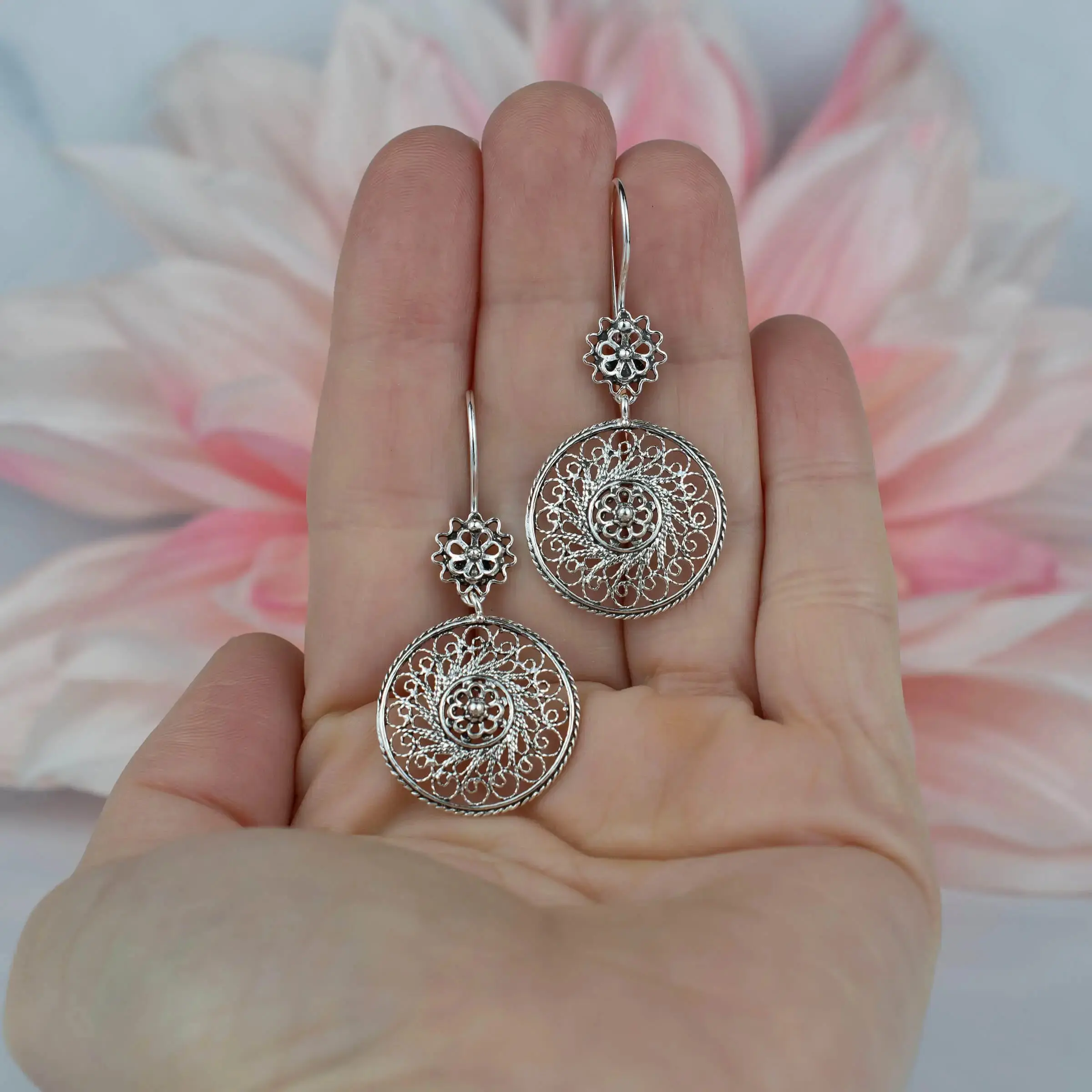 Indulge in the beauty of these exquisite earrings designed with an elegant spiral flower shape. Made of 925 sterling silver, these earrings feature intricate filigree work, creating a stunning visual effect that will leave you mesmerized.