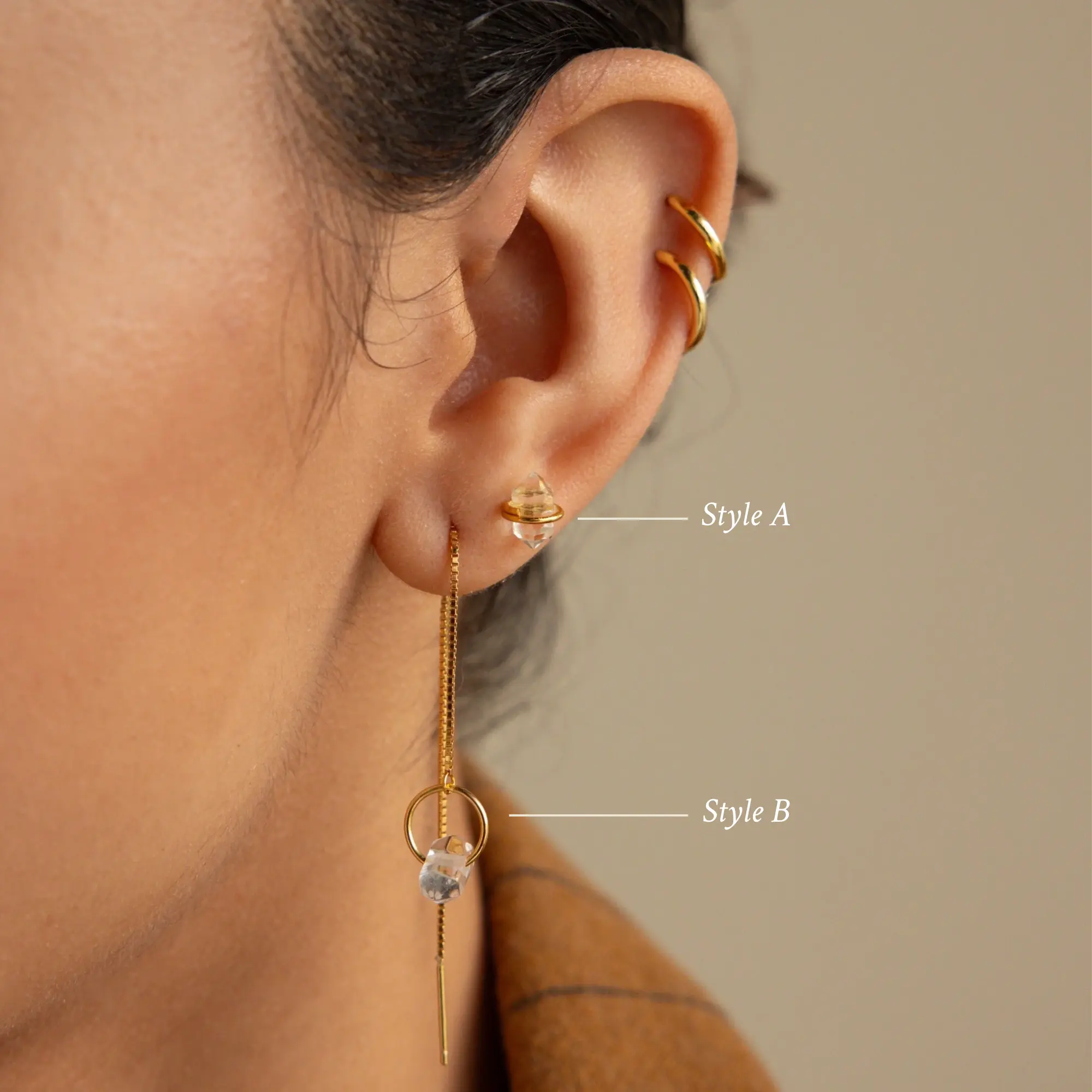I have been looking for Herkimer earrings for quite some time. I love the appropriate wire-wrapped design on the studs, and the threader Herkimers are perfect, and not overly heavy. Nice quality.