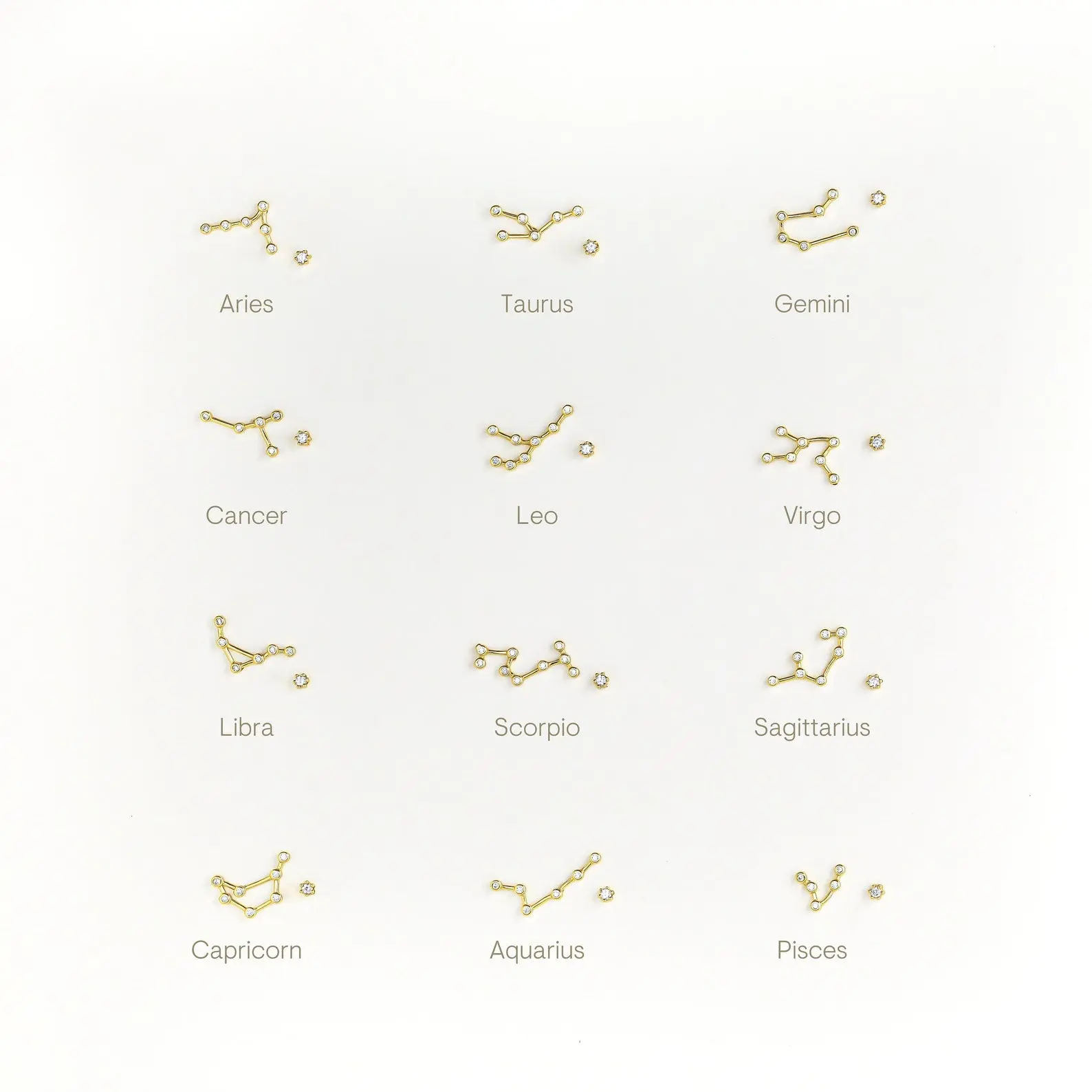 The ultimate star-gazer accessory, these Constellation Earrings are the perfect gift for a girl who loves astrology. Each pair of studs spotlight its own zodiac sign, featuring tiny diamonds for a celestial and feminine touch.