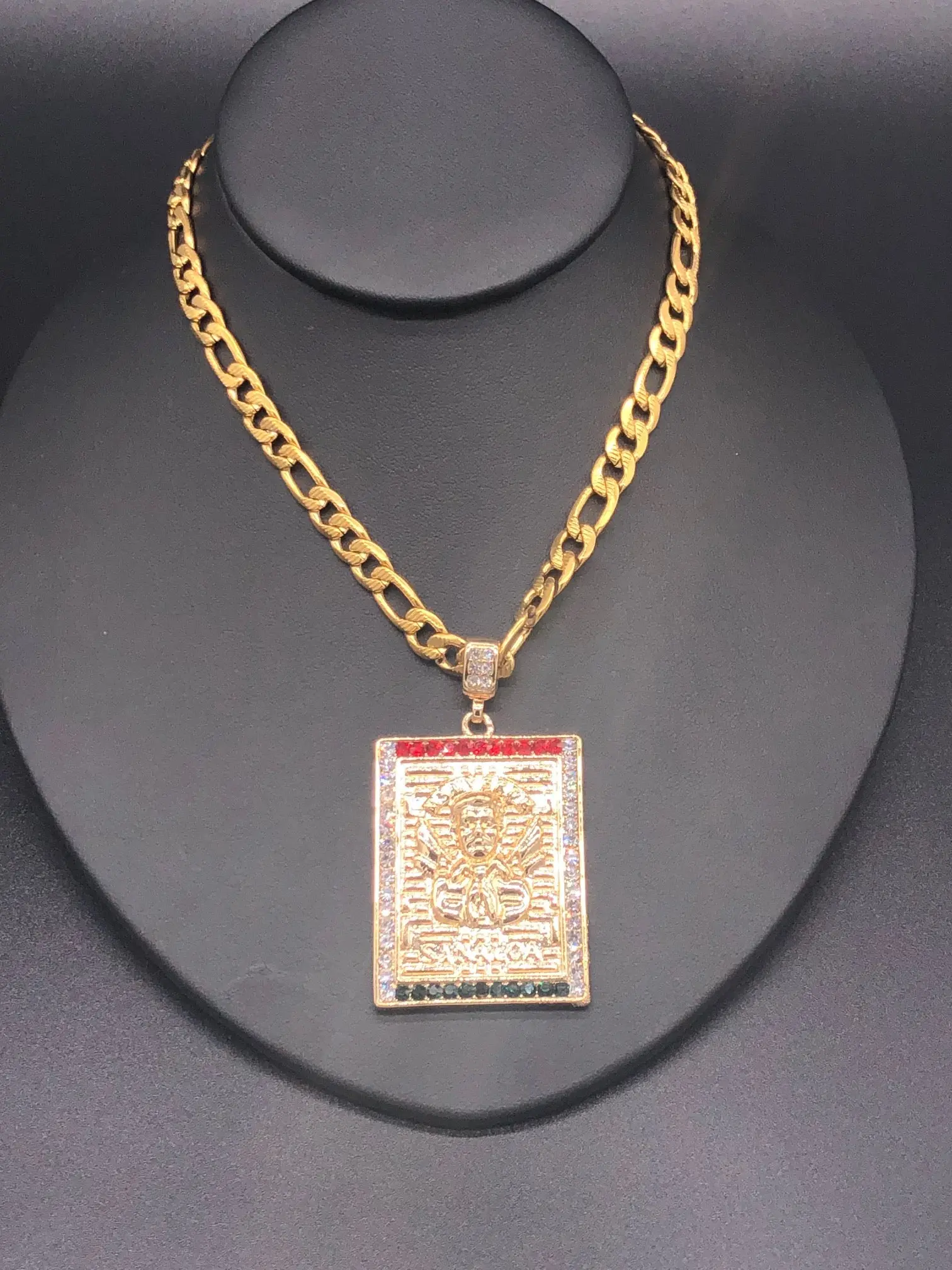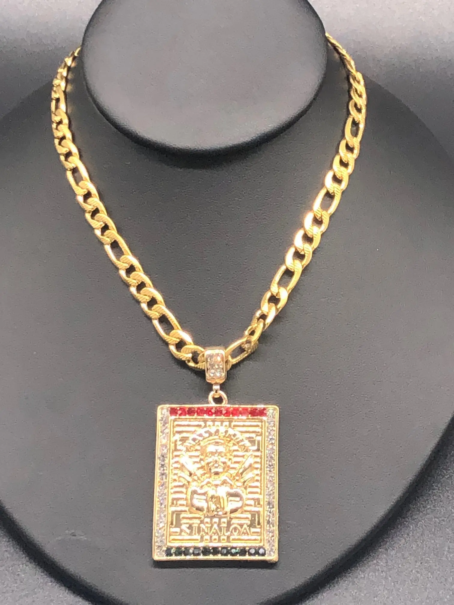 Pendant with the image of Jesus Malverde Includes a 26" Gold Plated over Stainless Steel Necklace24K Gold PlatedPendant Measures 3"Necklace Measures 26" and its 10 mm thick*Please Read in Detail*Rosarios Y Mas Inc. provides a life time warranty on all products. If the product gets damaged for any reason, we will exchange the item for free. All items are as described. Items sold by Rosarios Y Mas Inc. are either Gold Plated/Filled, Stainless Steel or Handmade beaded products. Please read item description in detail for all information regarding the item. Please contact us if you have any questions or concerns. My family and I appreciate your business.Rosarios Y Mas Inc. le da garantia de vida en su compra. Si el producto se dana por algún motivo, se lo cambiamos gratis. Todas las cadenas y medallas/dijes son hechas de Oro Laminado, Acero Inoxidable o hechas a mano. Por favor lea toda la información en detalle. Por cualquier pregunta o comentario, por favor comunícate con nosotros. Muchas Gracias por su compra!