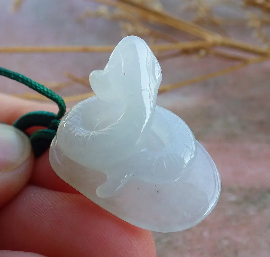 Certified Small Hand Carved Natural Myanmar Burma A Ice White Jade jadeite Zodiac Snake Pendant Necklace Include Jewelry Pouch ** Free **Include Jewelry String Cord (Free)All of our pendant will separate come with a string cord.JADEITE Undyed, 100% Natural A Jade JadeiteSIZE 25mm X 16mm X 13mmColor * See Photo *Certificate All Jadeite come with certificate