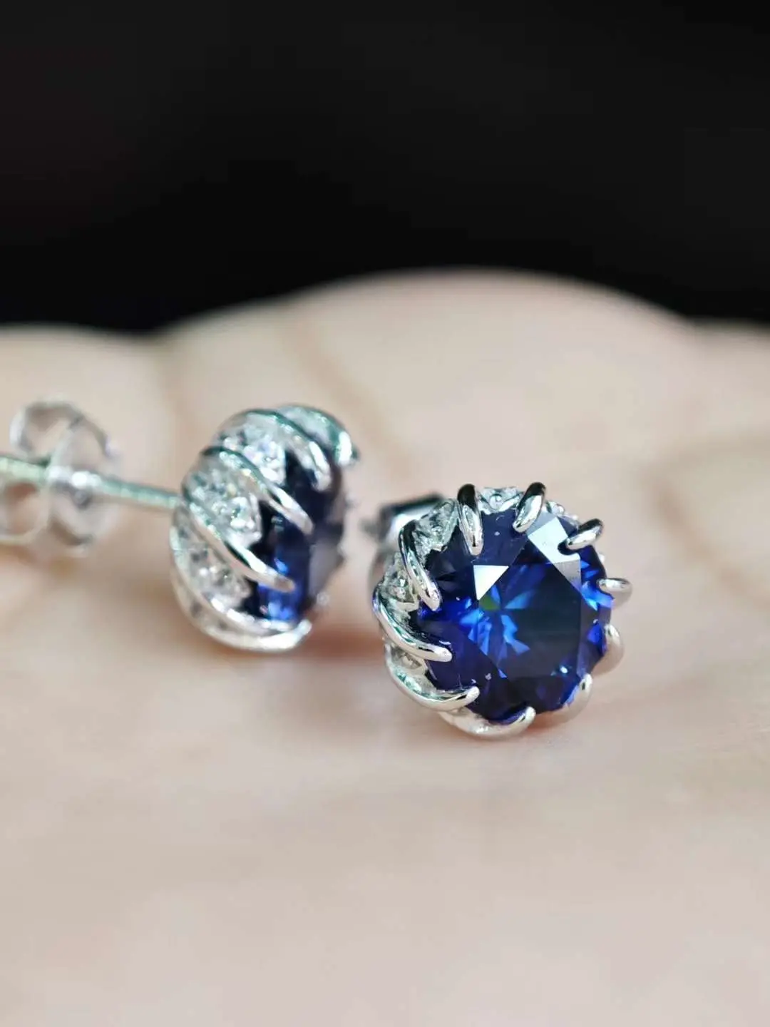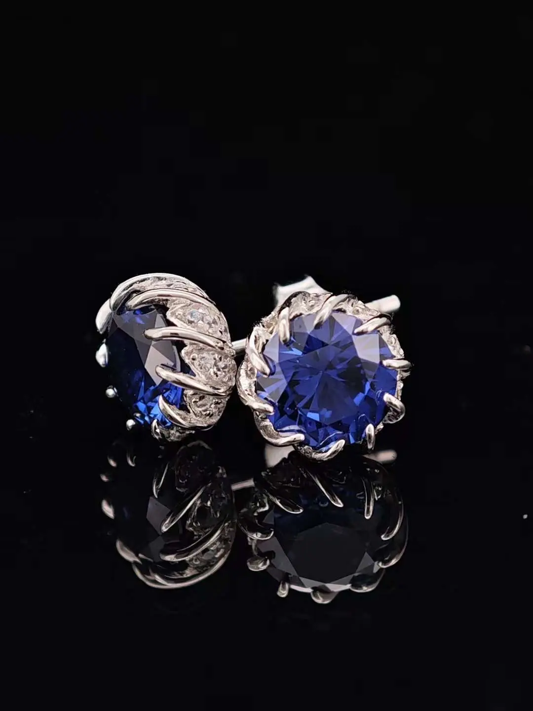These earring studs take the form of delicate flower buds, with meticulously curved calyxes designed to catch the light from every angle. Adorned with a pair of royal blue sapphires totaling 3-4 carats, these studs are set in sterling silver, heavily plated with white gold.