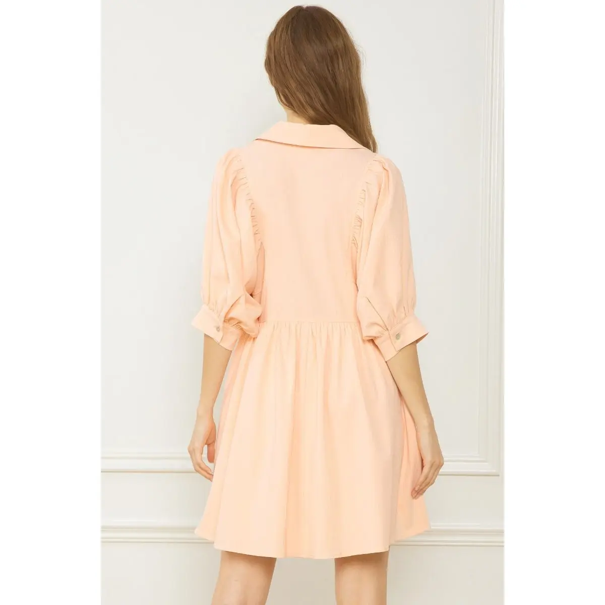 This dress is comfy, work friendly, and perfect for the spring! It has a collar detail, longer sleeves, and a comfy looser fit. Grab your true size but if between can size down