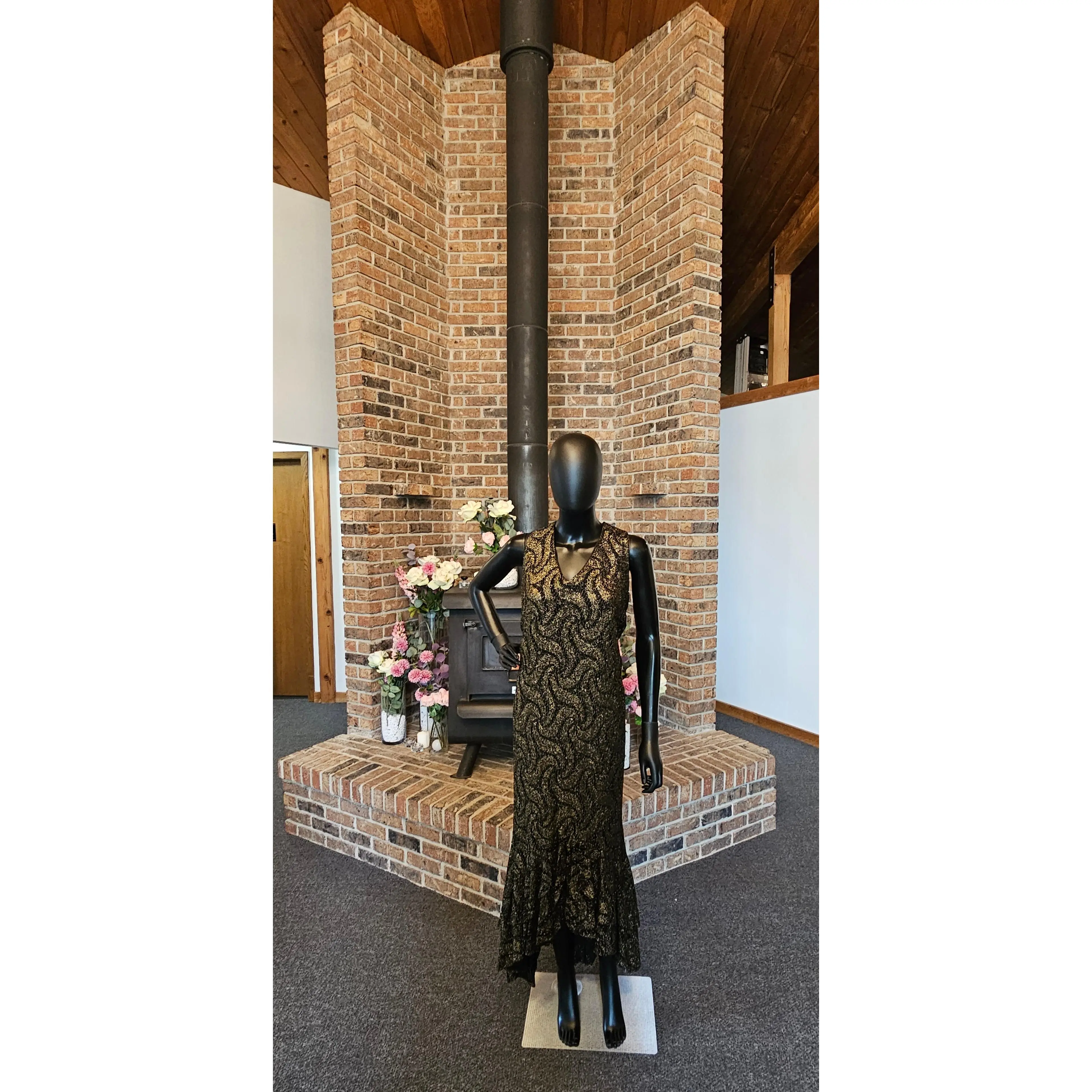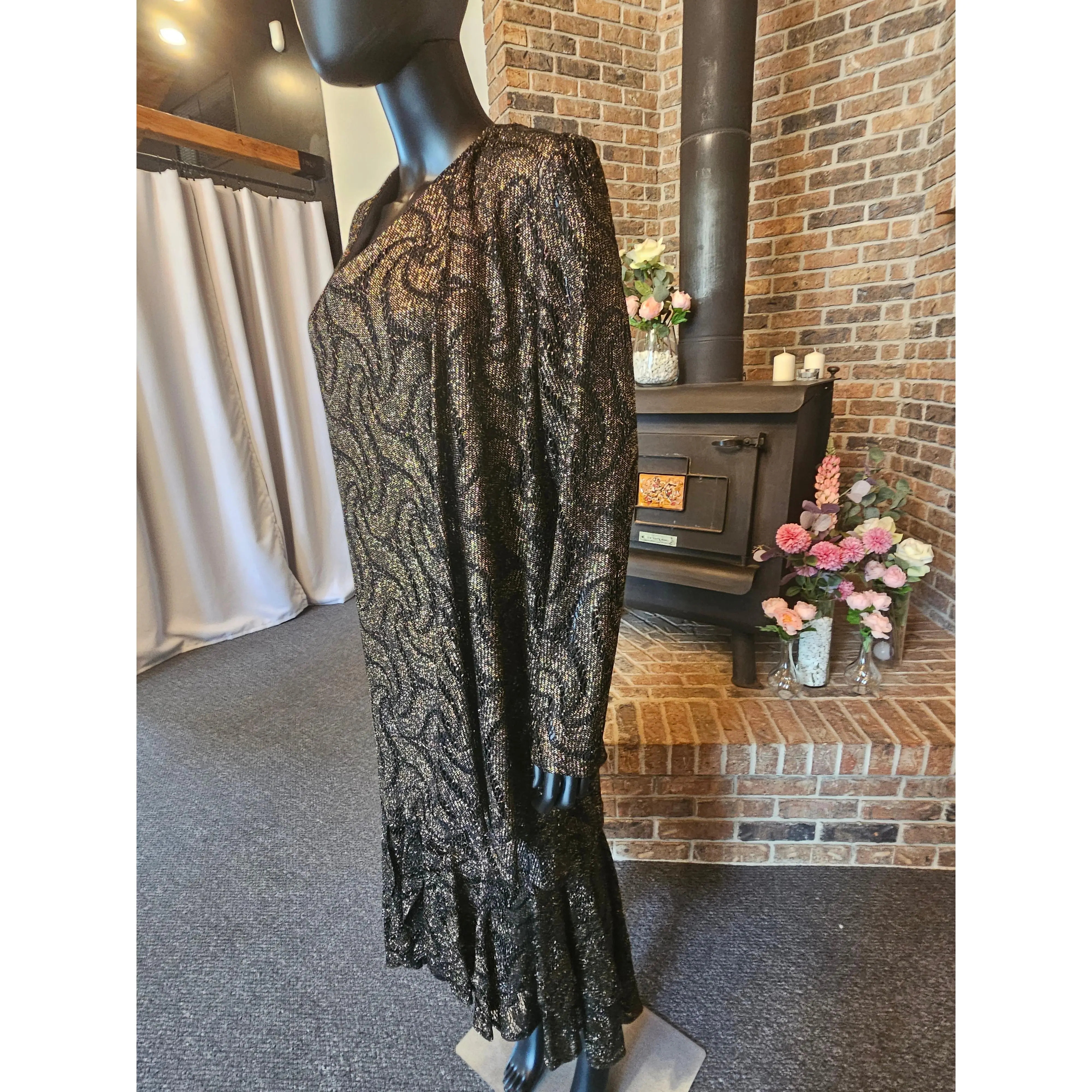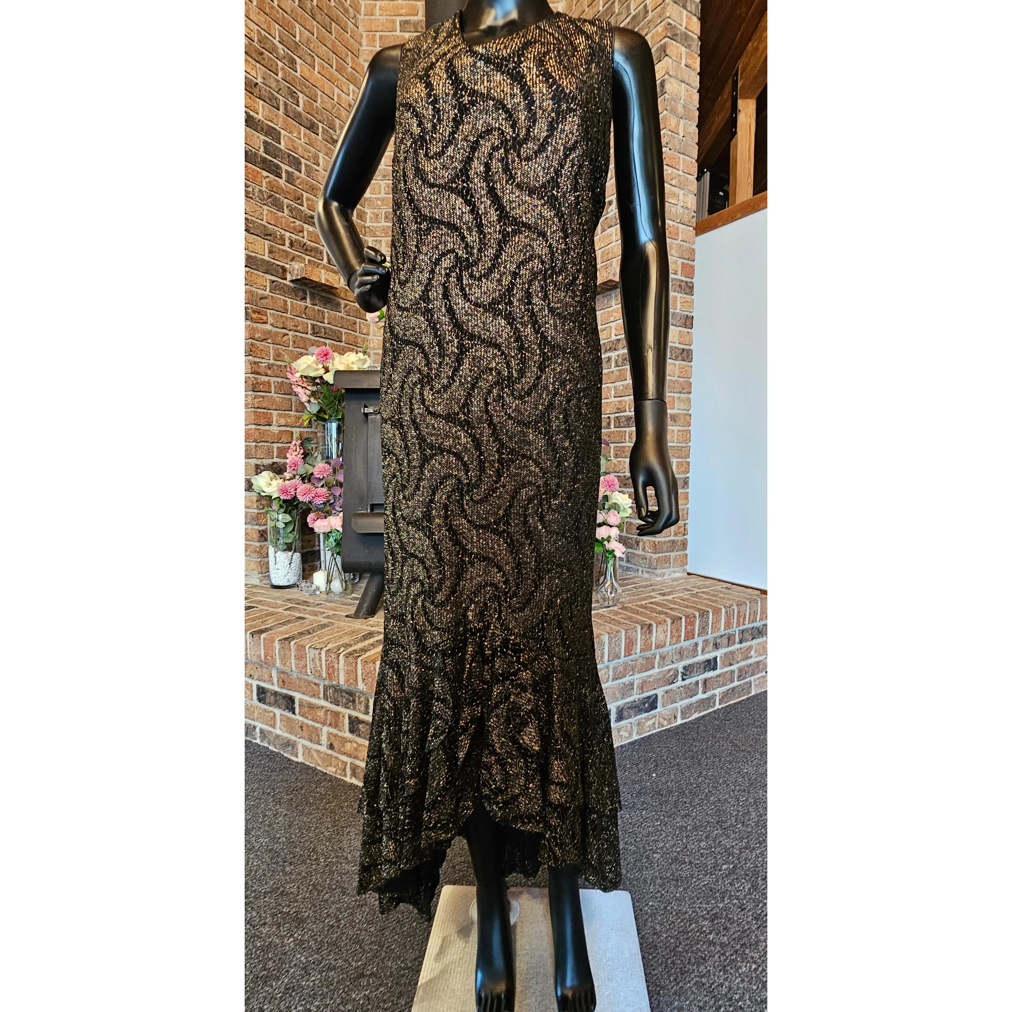 This elegant black and gold crochet dress boasts a beautiful gold woven pattern and a sleeveless design. To complete the look, it comes with a matching jacket. The flutter high-low hemline adds a touch of femininity to this sophisticated ensemble.