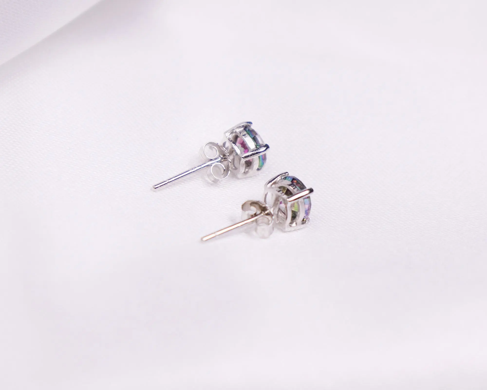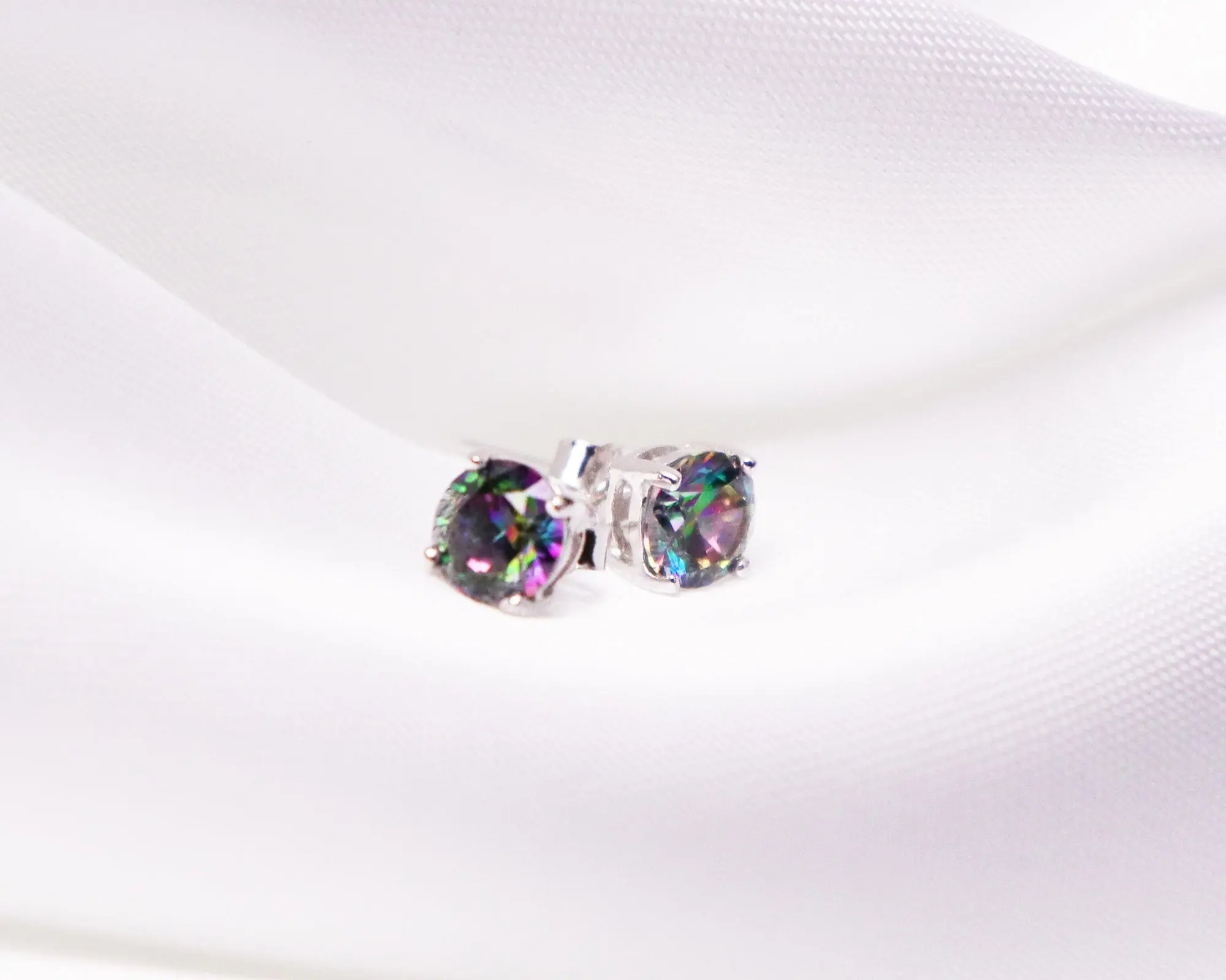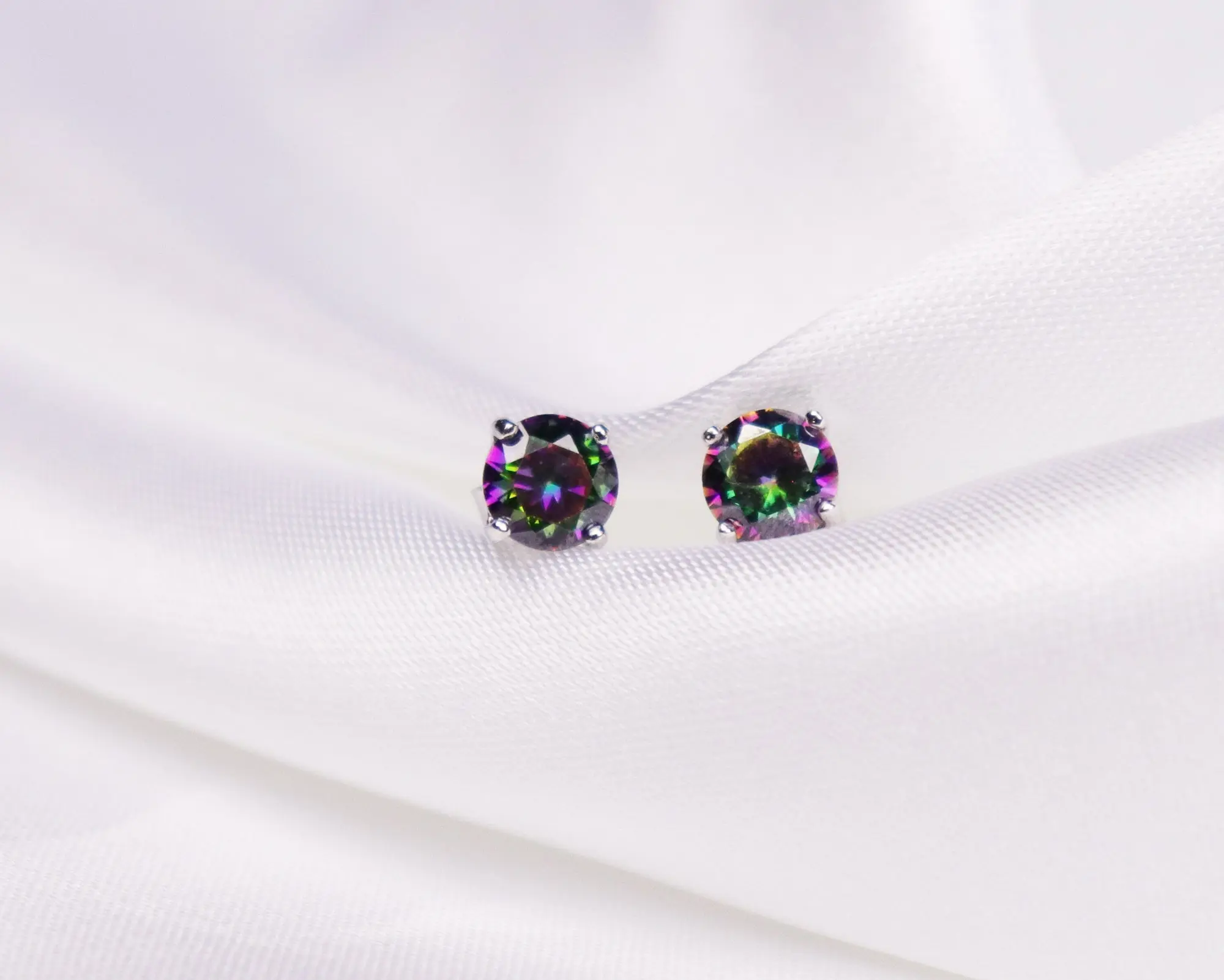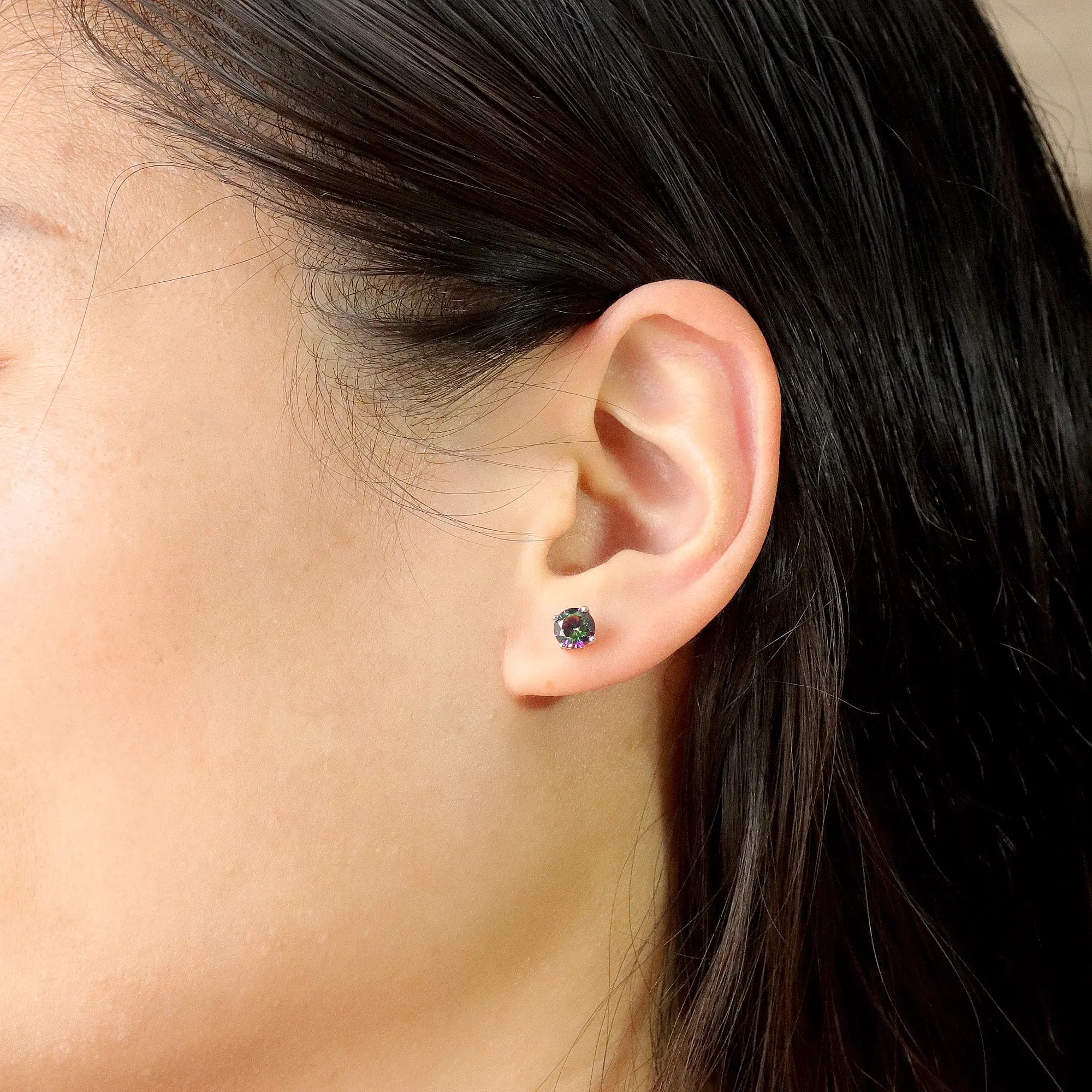 These earrings feature black mystic cubic zirconia as the central gemstone. Mystic cubic zirconia is a type of cubic zirconia with a unique color treatment that often results in iridescence or color-changing properties.