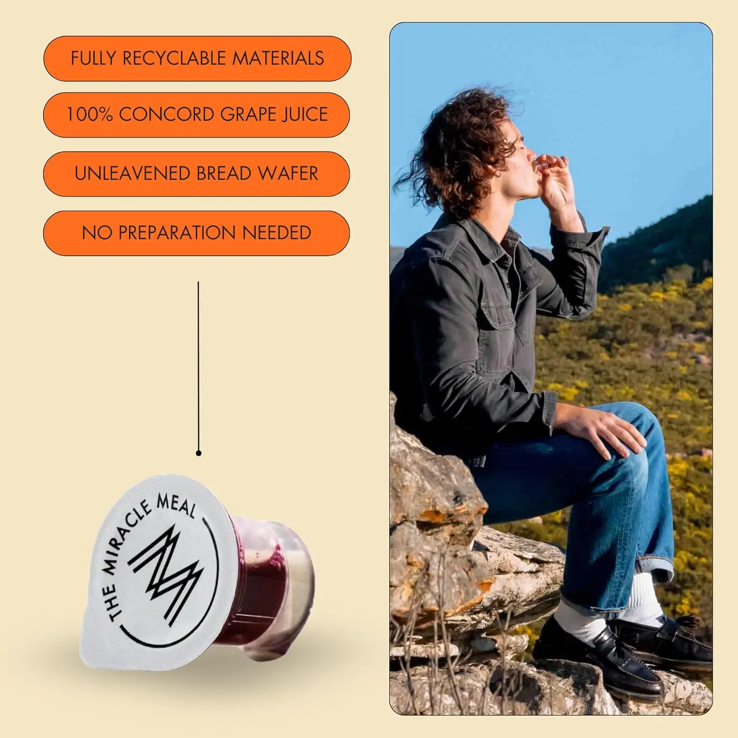 Introducing 'The Miracle Meal Pre-Packaged All in One Communion Cups' - the perfect solution for your communion needs. These convenient cups come with a wafer and 100% Concord Grape Juice, all pre-packaged in one easy-to-use cup.