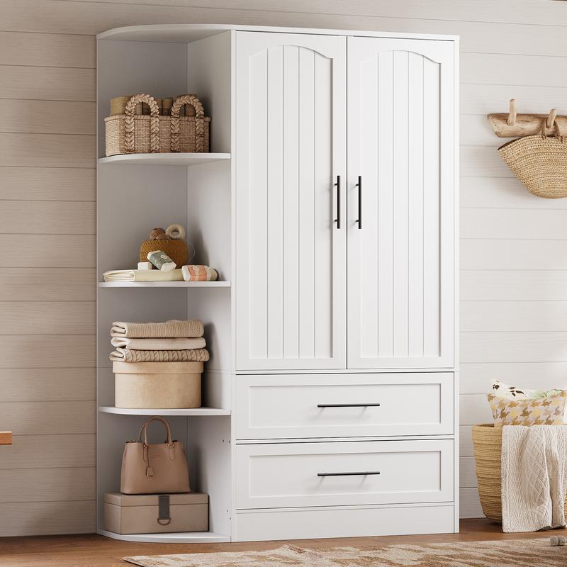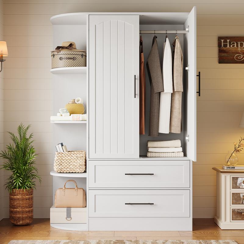 ·Spacious Closet: Measuring 39.4"L x 19.2"W x 70.9"H (approx. 99 x 49 x 183 cm), this double‑door wardrobe includes 2 drawers and 4 curved shelves, along with a hanging rod for organizing coats, dresses, clothing, and accessories