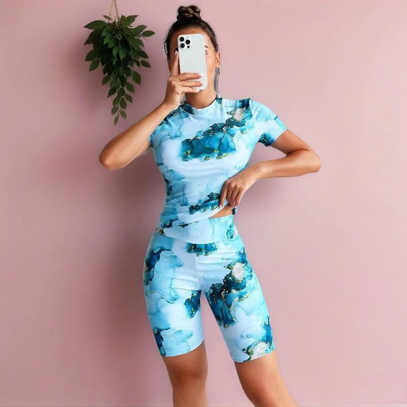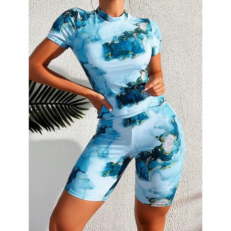 Women Marble Print Short Sleeve Rashguard Top