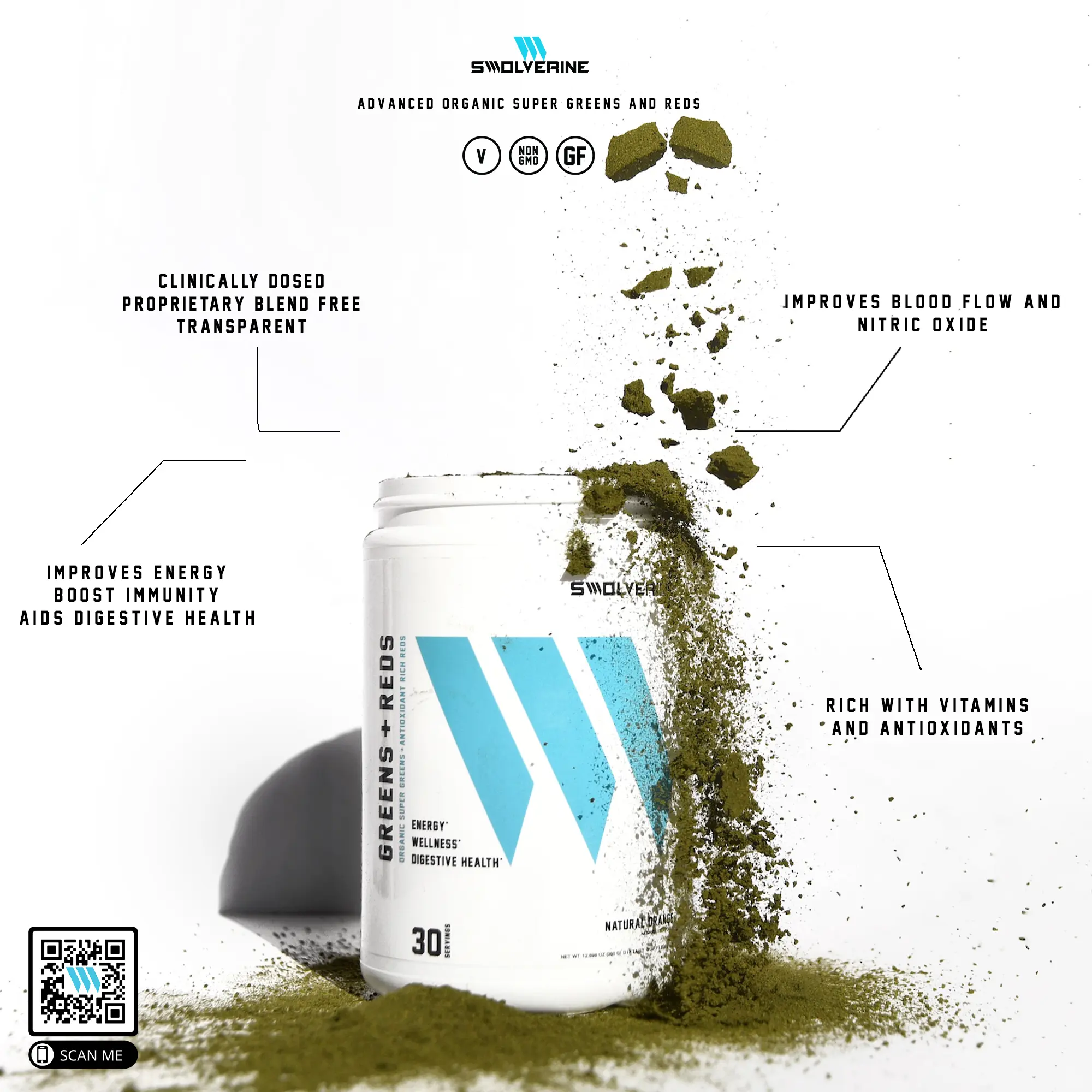 Swolverine's Greens + Reds supplement powder is a high-quality, proprietary blend-free combination of organic super greens and antioxidant-rich reds. Our Greens + Reds powder contains powerfully rich organic super greens from land and sea like Spirulina, Chlorella, Wheat Grass, and reds including Organic beets, Pomegranate, Acai, Organic Goji, Blueberry, and Organic Turmeric to improve your energy levels, power your athletic performance, bridge the gaps in your daily diet, and promote overall health and wellness.