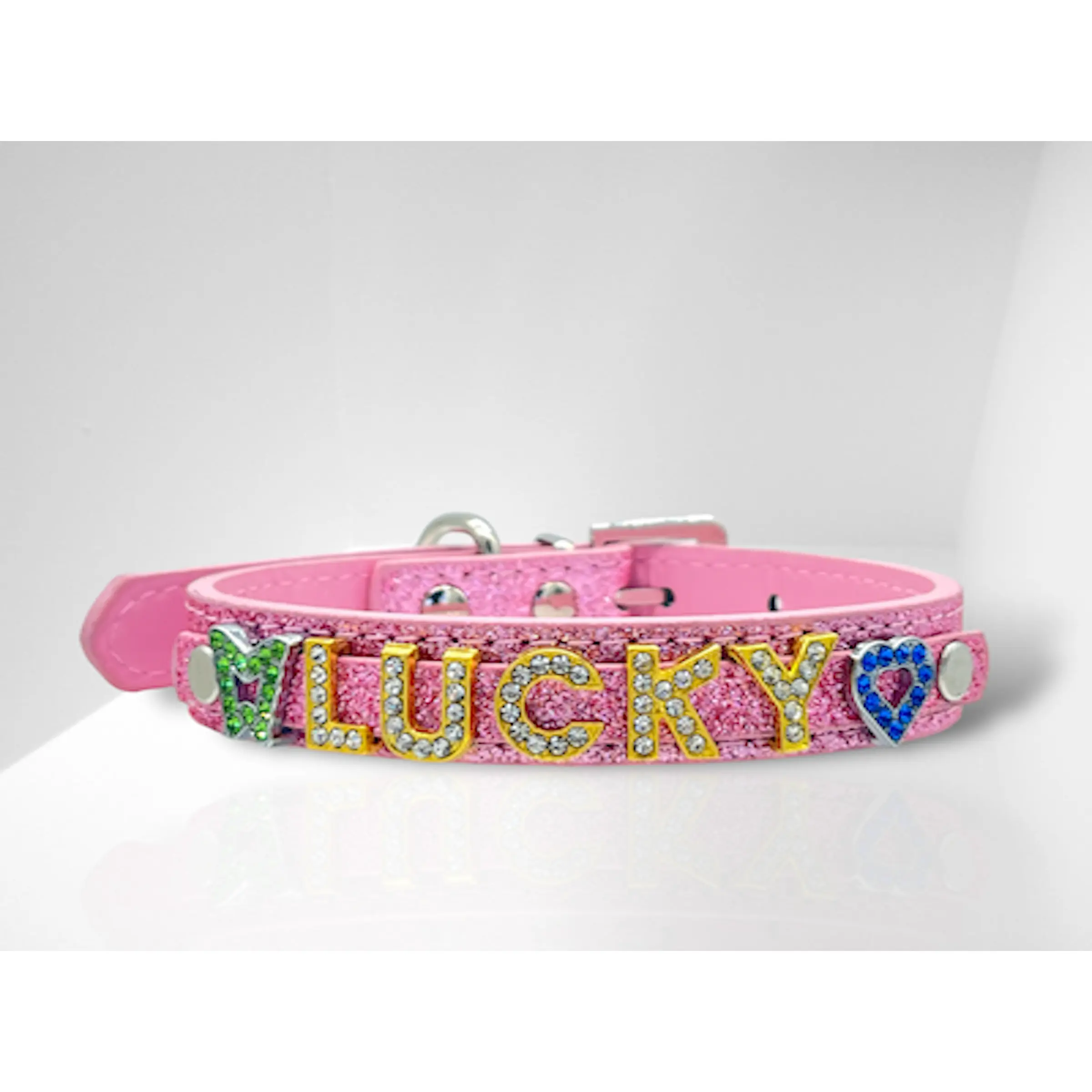 Introducing our Personalized Handmade PU Leather Dog Collar, a truly unique and stylish accessory that showcases your creativity and love for your furry companion. Crafted with care and attention to detail, this collar is the perfect blend of beauty and functionality.Each collar is customized with colorful rhinestone alphabet letters and symbols, allowing you to personalize it with your dog's name or any message that holds special meaning to you. The vibrant rhinestones add a touch of sparkle and charm, making your dog stand out in any setting.Made from high-quality PU leather, this collar offers the perfect balance of durability and comfort. The supple leather ensures a comfortable fit around your dog's neck, while the sturdy construction guarantees long-lasting use, even for the most adventurous pups.Not only does this collar exude style, but it also offers practicality. The adjustable buckle ensures a secure and snug fit, providing both safety and comfort for your four-legged friend. The D-ring allows for easy leash attachment, making walks and outings a breeze.Designed with both aesthetics and functionality in mind, our personalized handmade PU leather dog collar is a true testament to your pet's individuality and your creative expression. Make a statement and show off your unique style with this beautifully designed collar.Spoil your beloved pet with a collar that is as special and extraordinary as they are. Whether you're going for a walk in the park or attending a pet-friendly event, our personalized collar will surely turn heads and make your dog the center of attention.Indulge in the joy of personalization and treat your furry friend to a collar that reflects their personality and your artistic flair. Order your personalized handmade PU leather dog collar today and let your creativity shine through! Personalization We have multiple personalize options.1.Letters with Gems, (Silver w/ Blue, Silver w/ Pink, Gold w/ Clear)2.Letters with Plain Gold or Silver*3.Color Symbols(Heart, Butterfly, Flower and Star)4.Clear Symbols(Crown, Star, Full diamond heart, Regular Heart, Butterfly and Flower) Size XS-S Max 6 characters, M-XL Max 8 charactersExample: Coco- Blue and Pink MixToby- Blue + Blue Star + Red Heart Cici- Plain Gold + 2 Green Butterfly (one on each side)Let your creativity shine through !You may get some inspiration from our images.