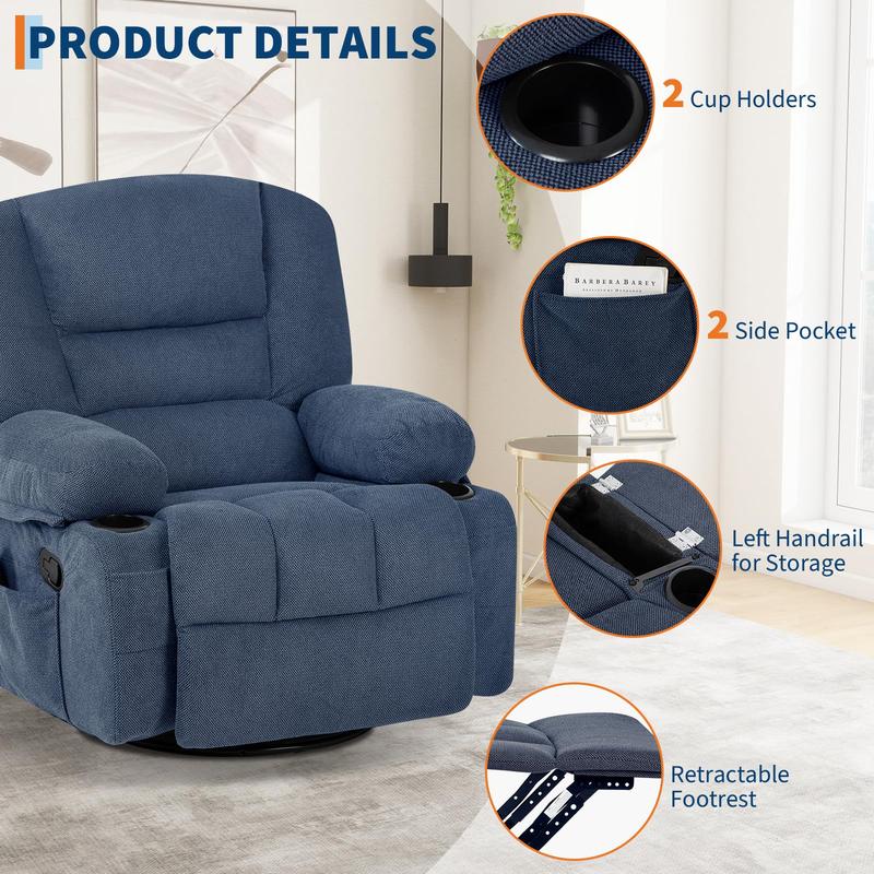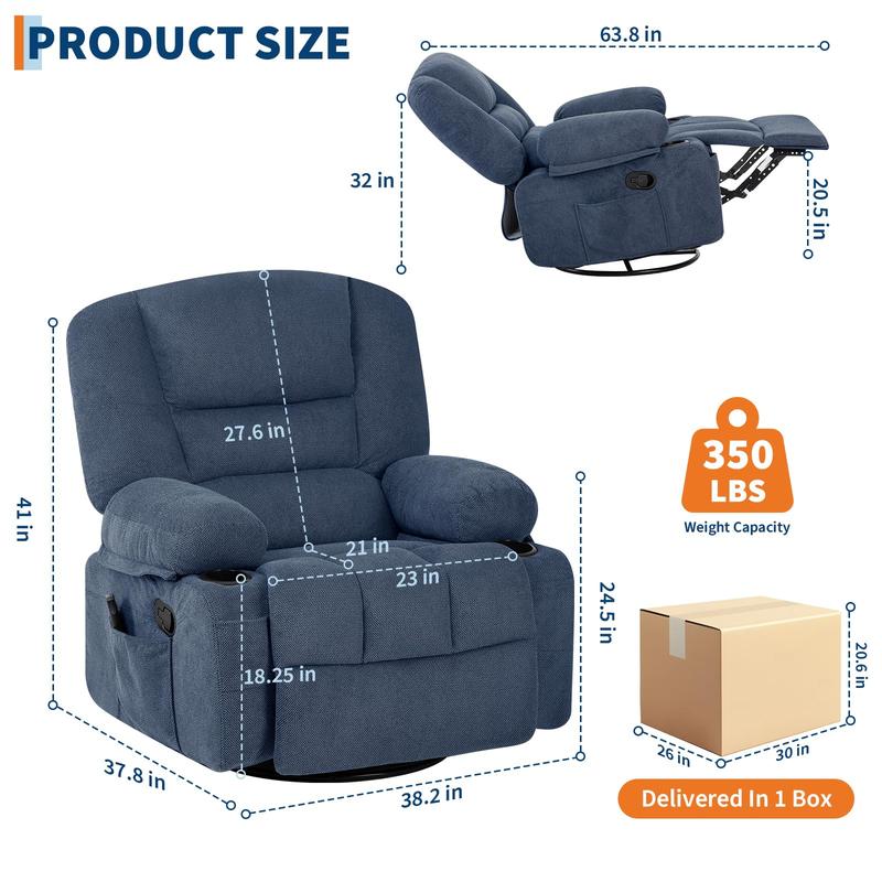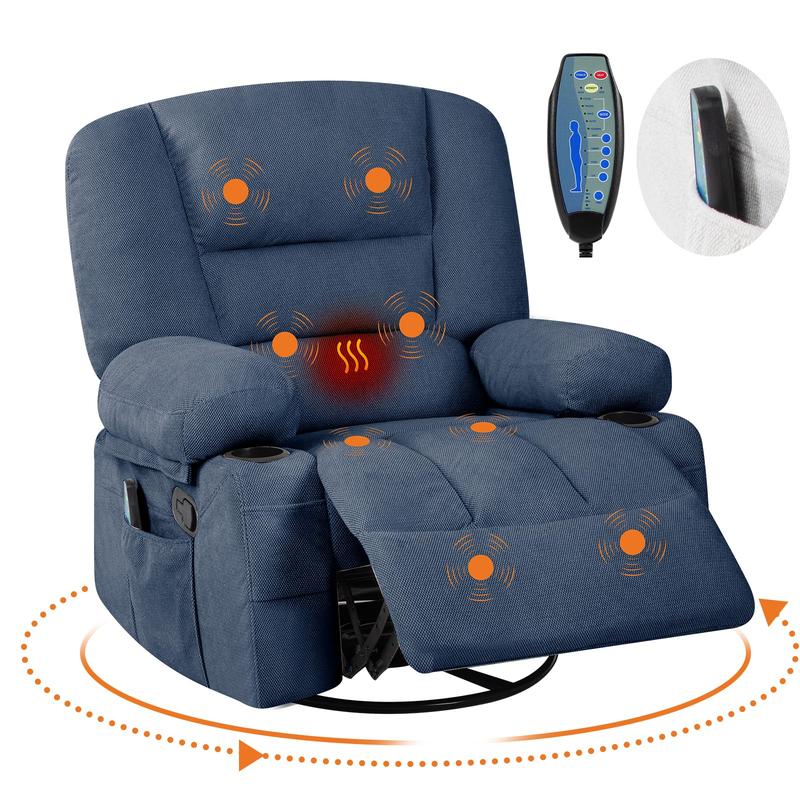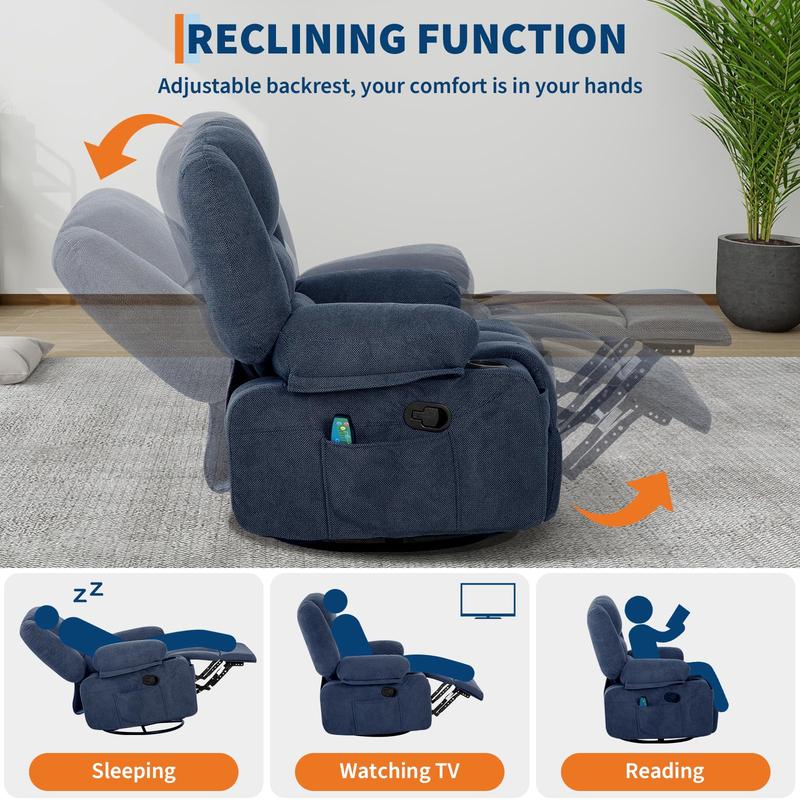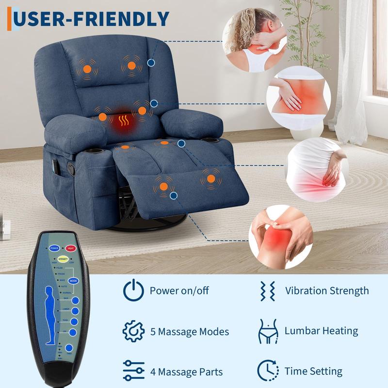 · Heated Massage & Adjustable Intensity:This swivel rocker recliner features 8 targeted massage points and a lumbar heating pad, this recliner helps relieve muscle fatigue. Customize your relaxation with adjustable massage modes and intensity levels via the included remote control, conveniently stored in the side pocket.