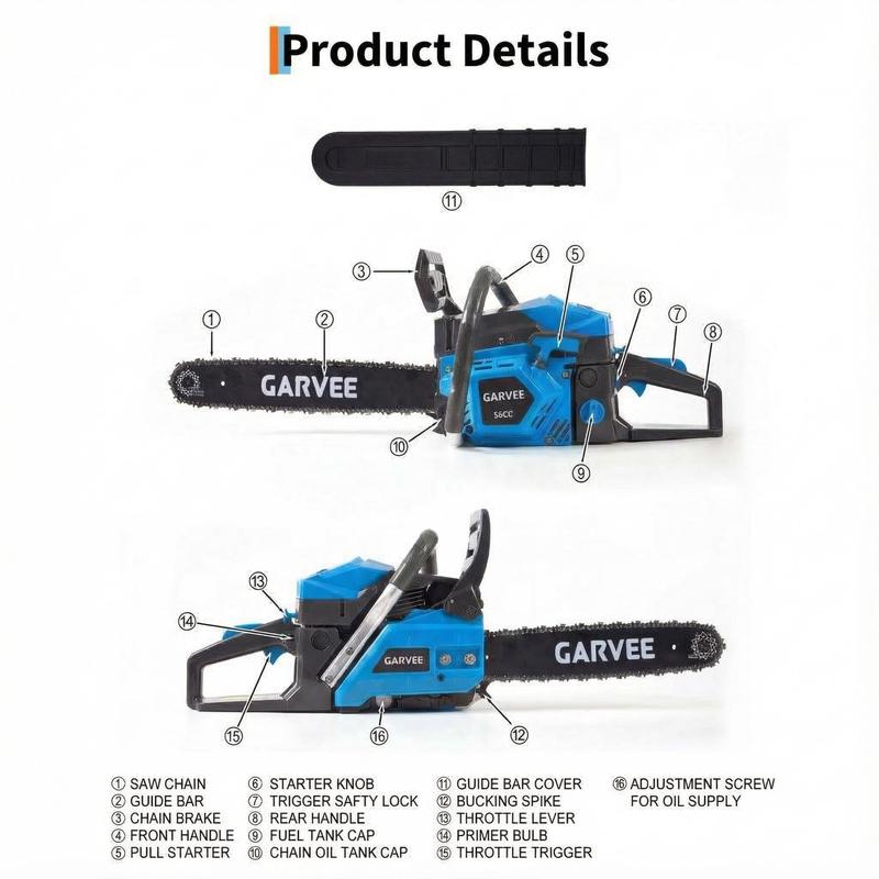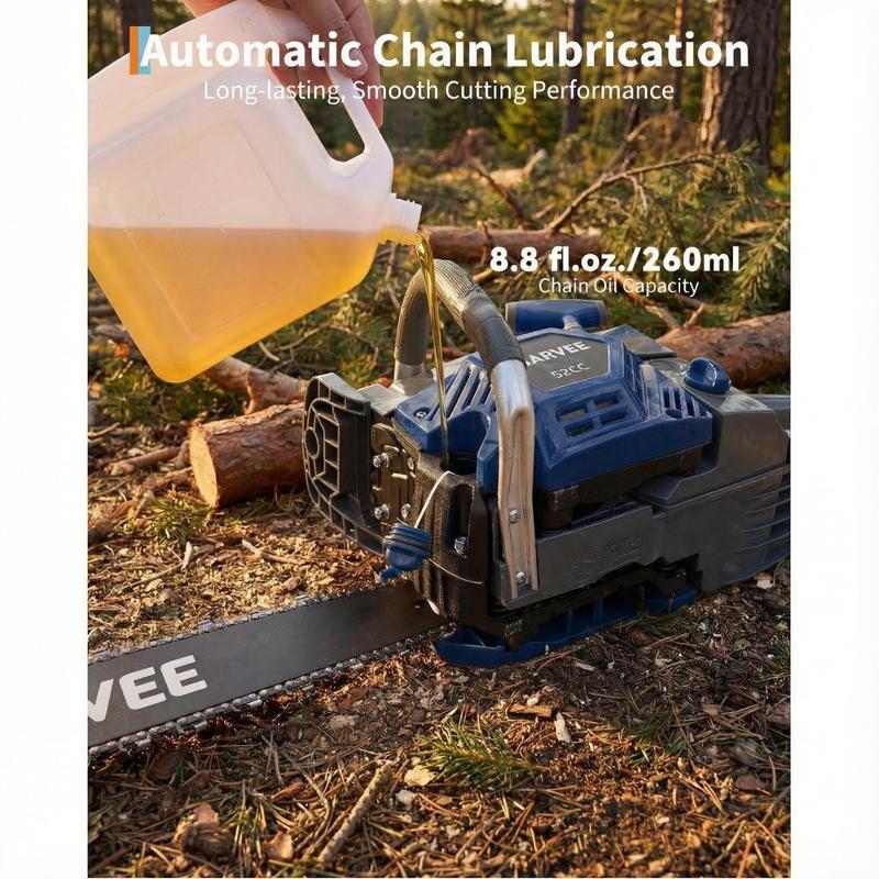 · Extended Runtime & Fast Refueling: Large 550ml–600ml fuel tank offers over 30 minutes of cutting per fill, with quick-refuel design and a 260ml automatic chain oiling system for smooth, long-lasting operation.