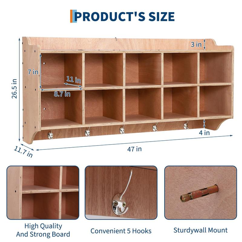 · Ample Storage for Organized SpacesFeaturing 10 cubbies and 5 hooks, this wall-mount locker offers plenty of room to keep coats, books, lunch bags, and other essentials neatly organized. Perfect as a classroom storage cabinet or for use in daycares, preschools, playrooms, mudrooms, and more.